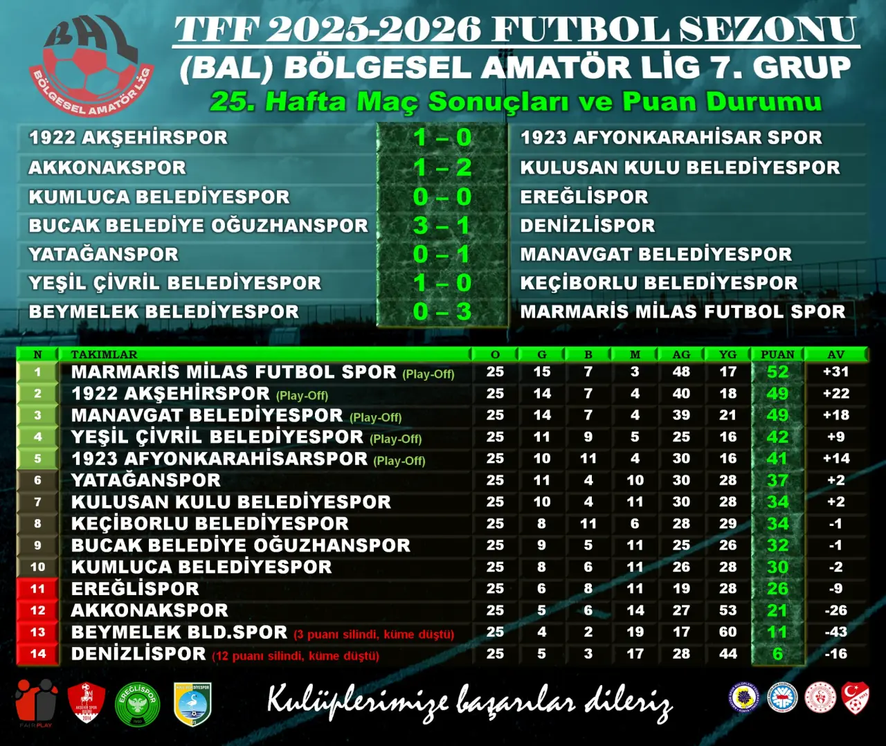 Bölgesel Amatör Lig 7. Grup'ta (BAL) normal sezonun bitimine bir hafta kaldı. 7. Grup’ta yer alan Konya ekiplerinden 1922 Akşehirspor ve Kulusan Kulu Belediyespor galip gelirken, FDM Yapı Ereğlispor berabere kaldı.