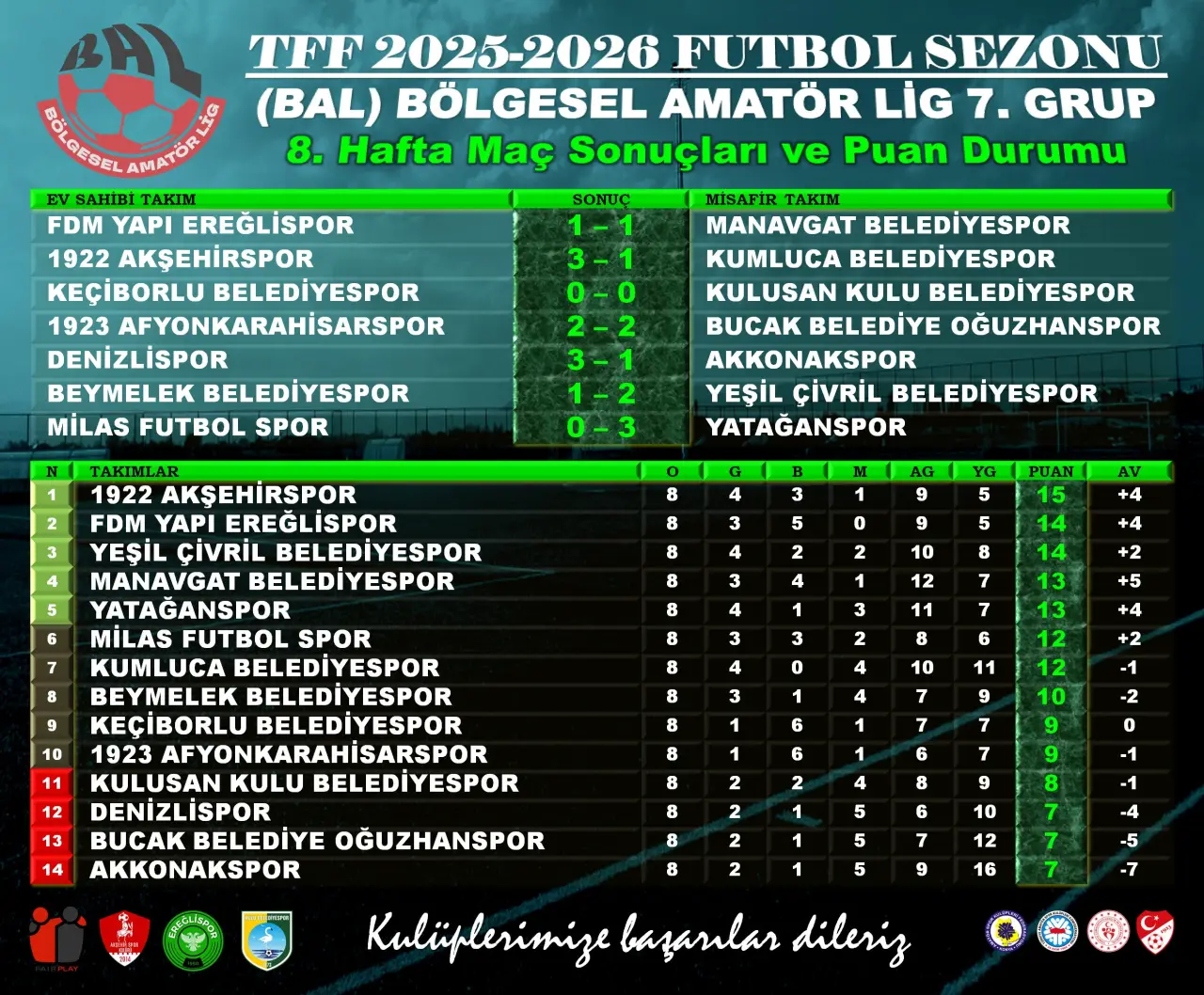Bölgesel Amatör Lig (BAL) 7. Grup’ta 8. hafta maçları oynandı. Konya takımlarından 1922 Akşehirspor galip gelirken, Ereğlispor ile Kulusan Kulu Belediyespor berabere kaldı.
