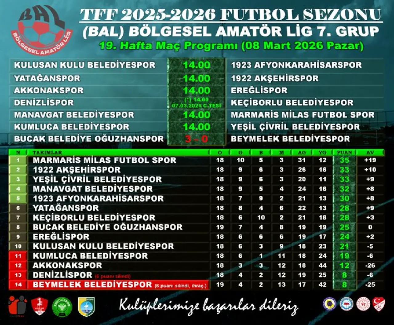 7. Grup’ta yer alan Konya ekipleri 1922 Akşehirspor, FDM Yapı Ereğlispor ve Kulusan Kulu Belediyespor, bugün saat 14.00’te rakipleri karşısında galibiyet savaşı verecek. Niyazi Kart yönetiminde üst üste 4 galibiyet alarak önemli bir çıkışa imza atan 1922 Akşehirspor, deplasmanda Muğla ekibi Yatağanspor ile karşılaşacak. Ligde 33 puanla ikinci sırada yer alan kırmızı-beyazlı ekip, galibiyet serisini sürdürmek istiyor.