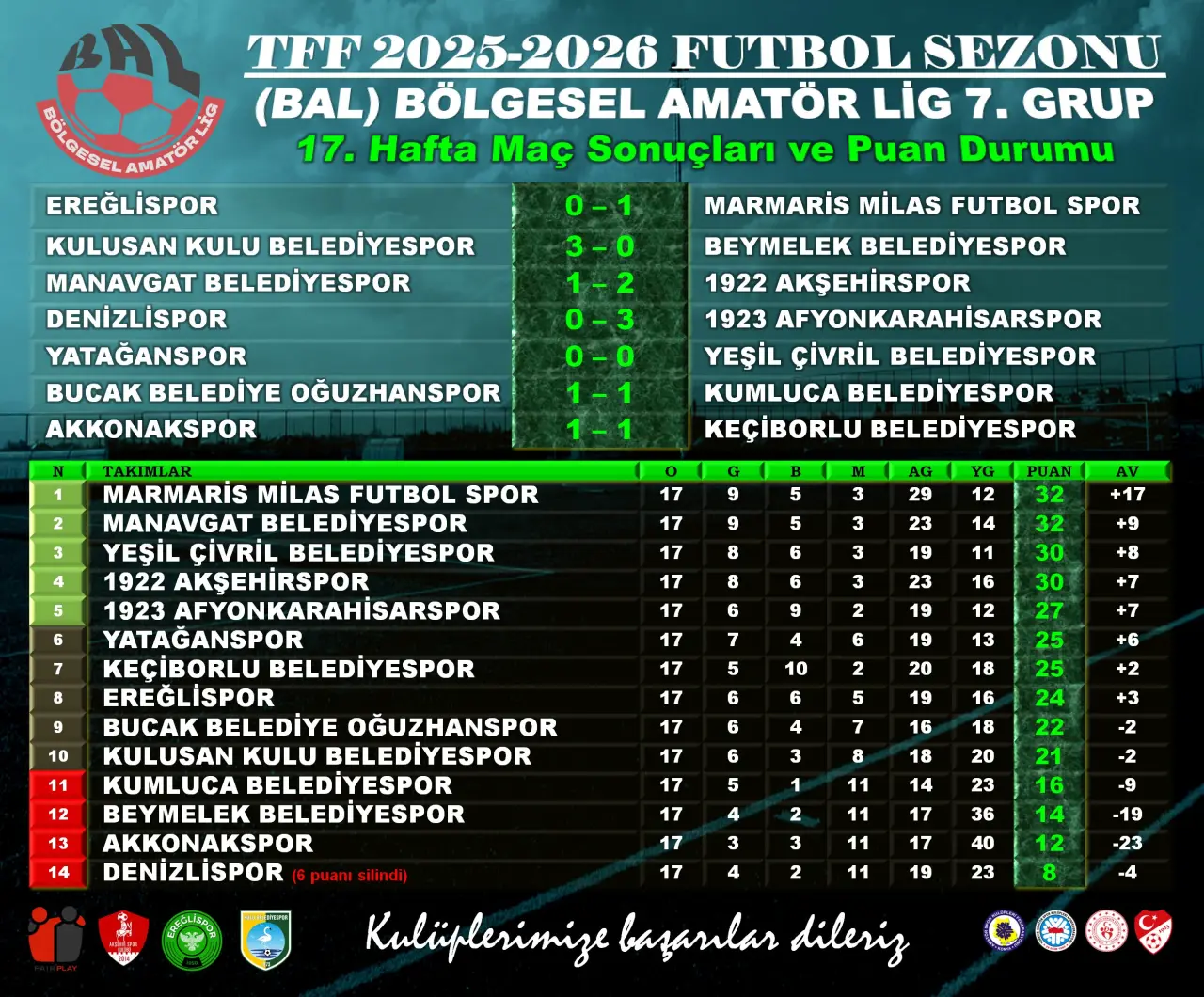 Bölgesel Amatör Lig’de heyecan 17. hafta maçlarıyla devam etti. 7. Grup’ta yer alan Konya takımlarından 1922 Akşehirspor ve Kulusan Kulu Belediyespor haftayı galibiyetlerle kapatırken, sıkıntılı günlerden geçen FDM Yapı Ereğlispor ise 3 puan hasretini yine dindiremedi.