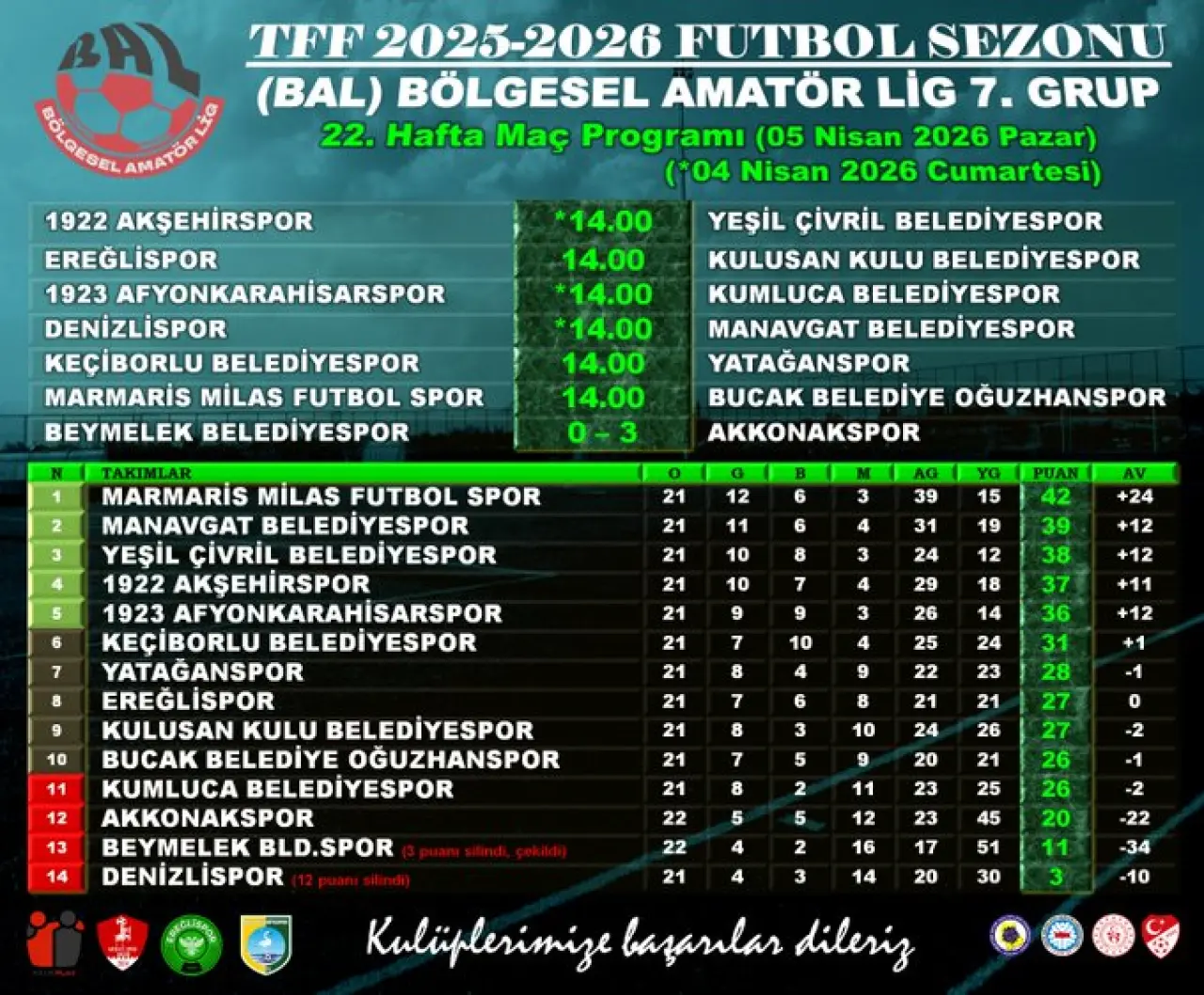Son 2 haftada 5 puan kaybederek şampiyonluk yarışında ağır bir yara alan 1922 Akşehirspor, bugün sahasında Yeşil Çivril Belediyespor’u konuk edecek. Sarayönü İlçe Stadyumu’nda oynanacak zorlu mücadele bugün saat 14.00’te başlayacak. Mücadeleyi İzmir bölgesi hakemi Mehmet Çağatay Lakot yönetecek. 1922 Akşehirspor 37 puanla ligde 5. sırada yer alırken, Denizli ekibi ise haftaya 38 puanla üçüncü sırada giriyor.