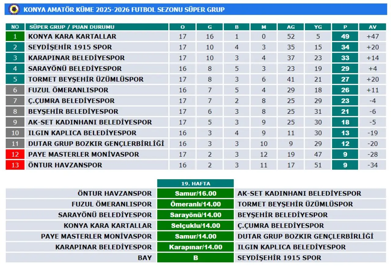 13 takımın yer aldığı ligde 6 karşılaşma oynanacak. Bölgesel Amatör Lig için gün sayan Konya Kara Kartallar, 49 puanla zirvede yer alıyor. Siyah-beyazlılar, şu ana kadar bir beraberlik dışında tüm maçlarını kazandı.
