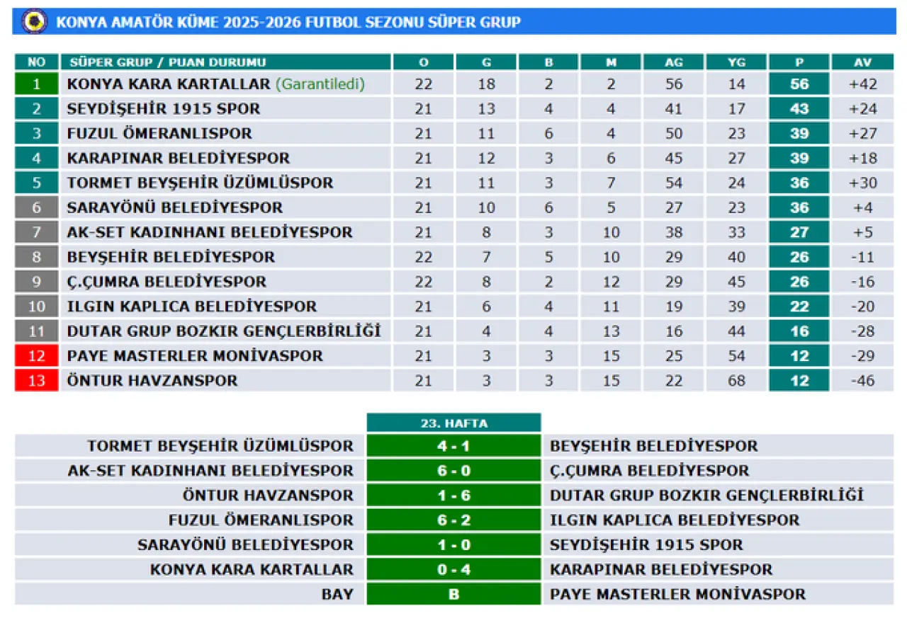 Şampiyonluğunu daha önce garantileyen ve prestij maçlarına çıkan Konya Kara Kartallar, sahasında Karapınar Belediyespor’a 4-0 mağlup oldu. Sezonun bitimine 3 hafta kala play-off hattında Seydişehir 1915, Fuzul Ömeranlıspor, Karapınar Belediyespor ve Beyşehir Üzümlüspor yer alıyor.