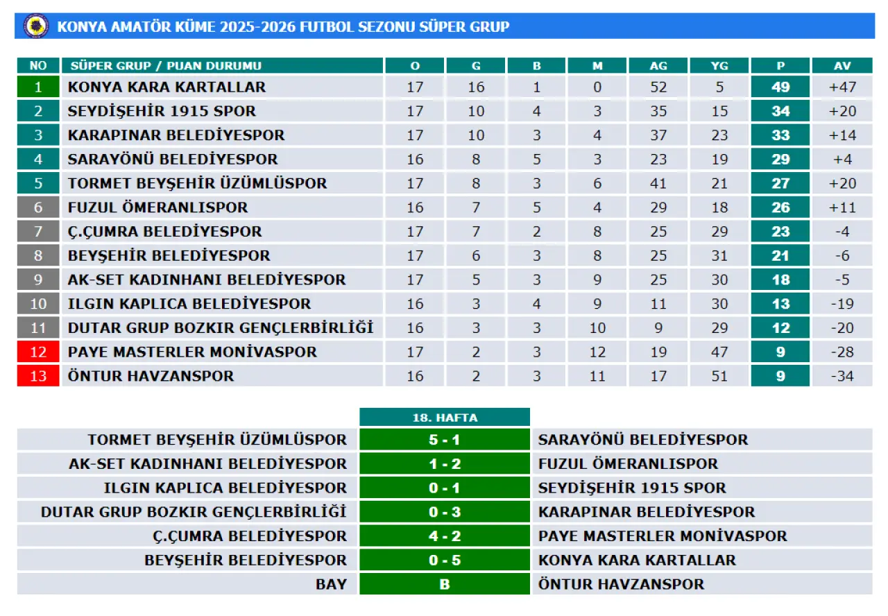 13 takımın yer aldığı Süper Küme’de 6 karşılaşma oynanacak. Gollü geçen haftada fileler 24 kez havalandı. Haftayı Öntur Havzanspor, fikstür gereği maç yapmadan geçirdi. Namağlup zirvede yer alan ve Bölgesel Amatör Lig’i garantileyen Konya Kara Kartallar, deplasmanda Beyşehir Belediyespor’u 5-0 mağlup ederek puanını 49’a çıkardı. İkinci sırada yer alan Seydişehir 1915 ise Ilgın Kaplıca Belediyespor’u deplasmanda 1-0 geçerek puanını 34’e çıkardı.