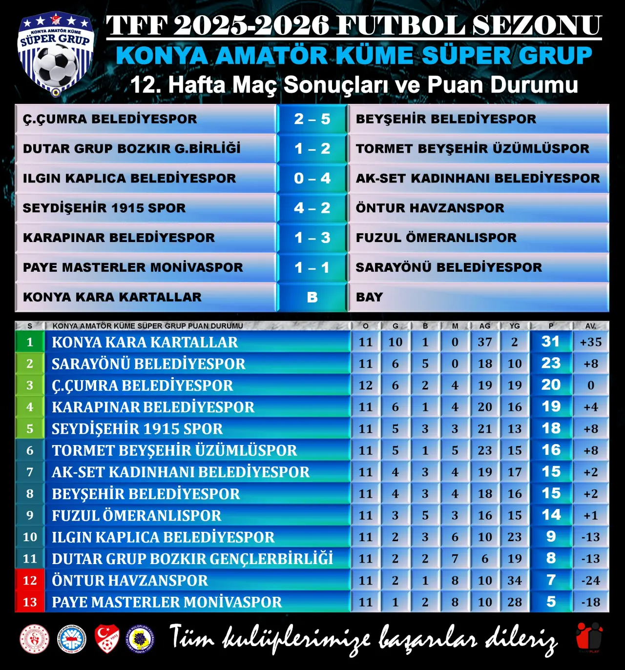 Konya Süper Amatör Küme’de heyecan 12. hafta maçlarıyla devam etti. 13 takımın yer aldığı ligde 6 karşılaşma oynandı. 31 puanla zirvede yer alan Konya Kara Kartallar, haftayı fikstür gereği Bay olarak geçti. Tüm karşılaşmalarda gol sesi çıkarken, fileler toplamda 26 kez havalandı.