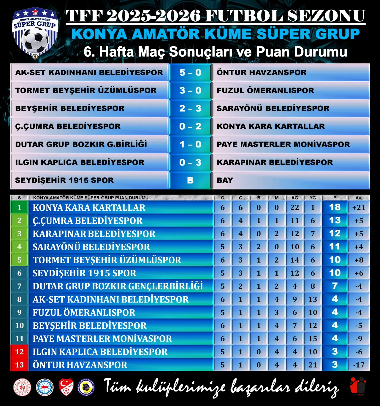 Konya Kara Kartallar, Çumra deplasmanında iki golle kazandı. Siyah-beyazlı ekip, 18 puanla liderliğini sürdürüyor. Galibiyetsiz takımın olmadığı ligde Havzanspor ve Ilgın Kaplıca Belediyespor, küme düşme hattında yer alıyor.