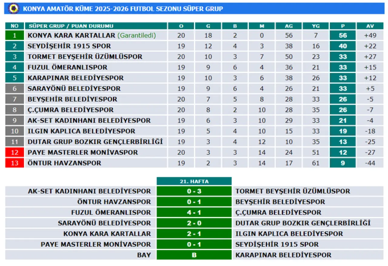 13 takımın yer aldığı ligde 6 karşılaşma oynandı. Geride kalan haftada fileler 15 kez havalandı. Karapınar Belediyespor fikstür gereği haftayı Bay olarak geçti. Namağlup zirvede yer alan Konya Kara Kartallar, evinde Ilgın Kaplıca Belediyespor’u 2-1 yenerek şampiyonluğu garantiledi. Puanını 56’ya çıkaran siyah-beyazlılar, Bölgesel Amatör Lig’e yükselmeyi garantiledi.