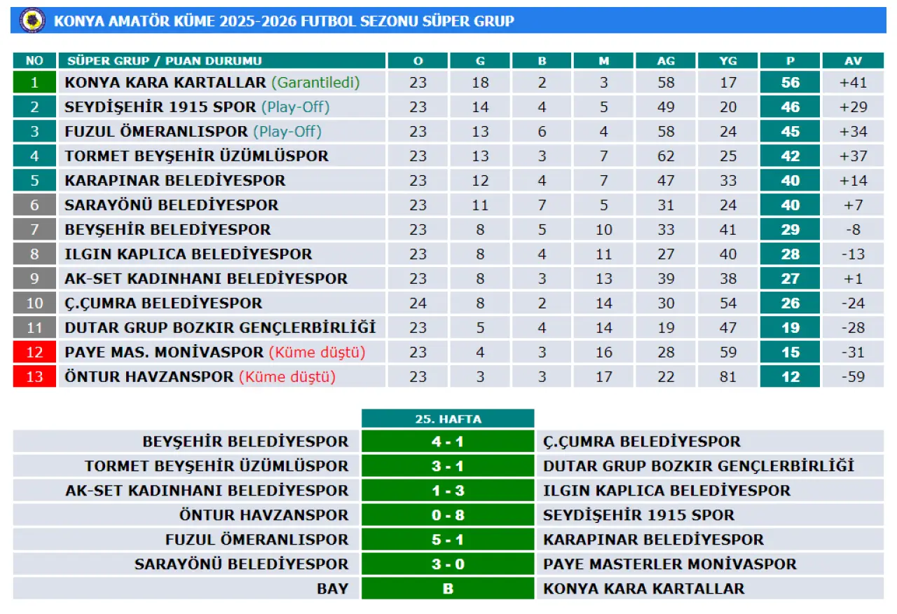Konya Süper Amatör Grup'ta normal sezonun bitimine 1 hafta kala play-off yarışı henüz tamamlanmadı. Süper Küme’de 25. hafta geride kaldı. 13 takımın yer aldığı ligde 6 maç oynandı. Daha önce Bölgesel Amatör Lig’e yükselmeyi garantileyen Meram Kara Kartallar, haftayı maç yapmadan geçirdi. Gollü geçen haftada 25. haftada fileler 30 kez havalandı.
