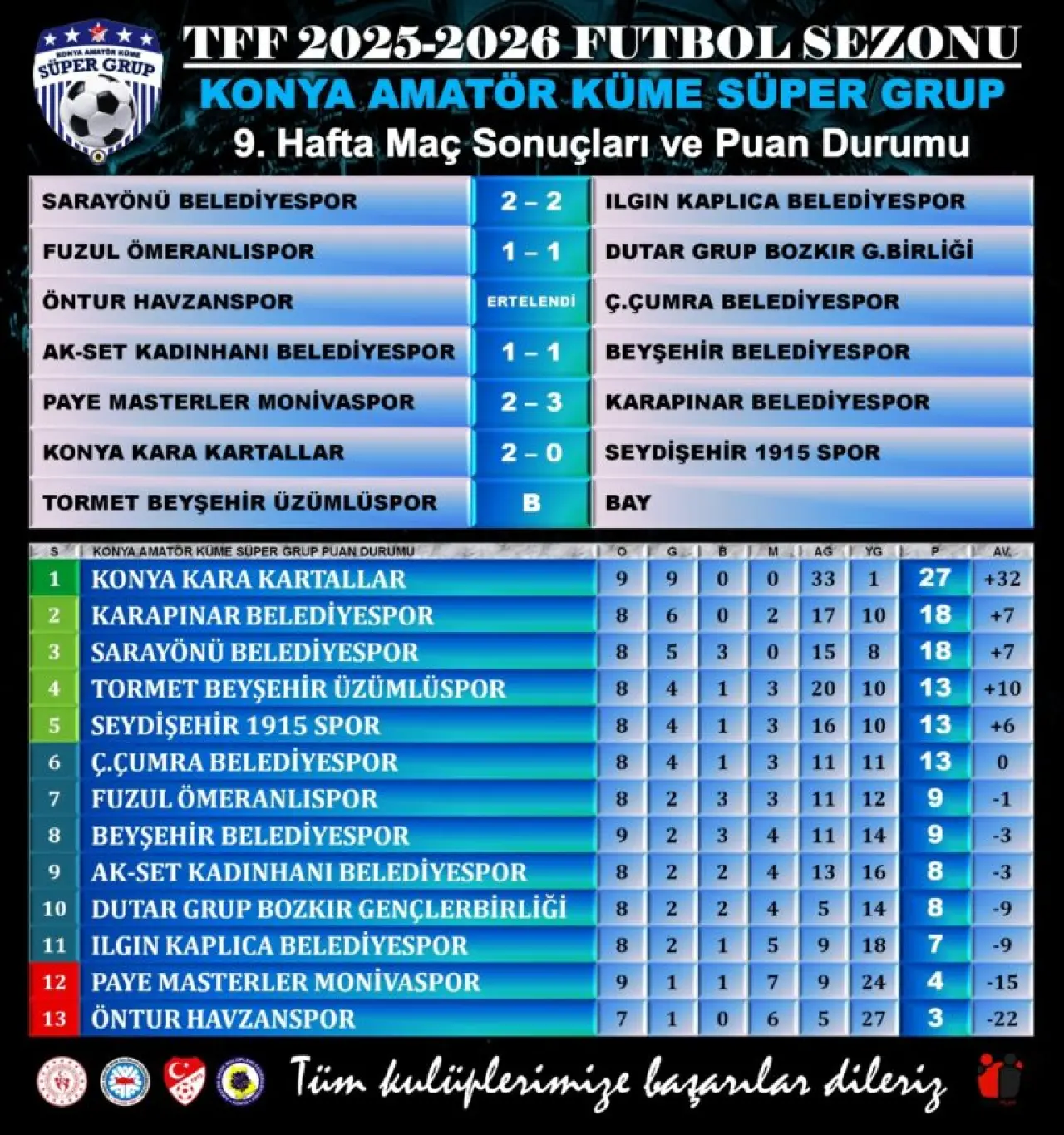 Lider Konya Kara Kartallar, evinde Seydişehir 1915’i 2-0 yendi. 8’de 8 yapan ve puanını 27’ye çıkaran siyah-beyazlılar, şampiyonluk yolunda önemli bir avantaj elde etti. Karapınar Belediyespor ise deplasmanda Masterler Monivaspor’u 3-2 mağlup ederek 18 puanla ikinci sıradaki yerini korudu. Galibiyetsiz takımın yer almadığı ligde Monivaspor ve Havzanspor küme düşme hattında yer alıyor.