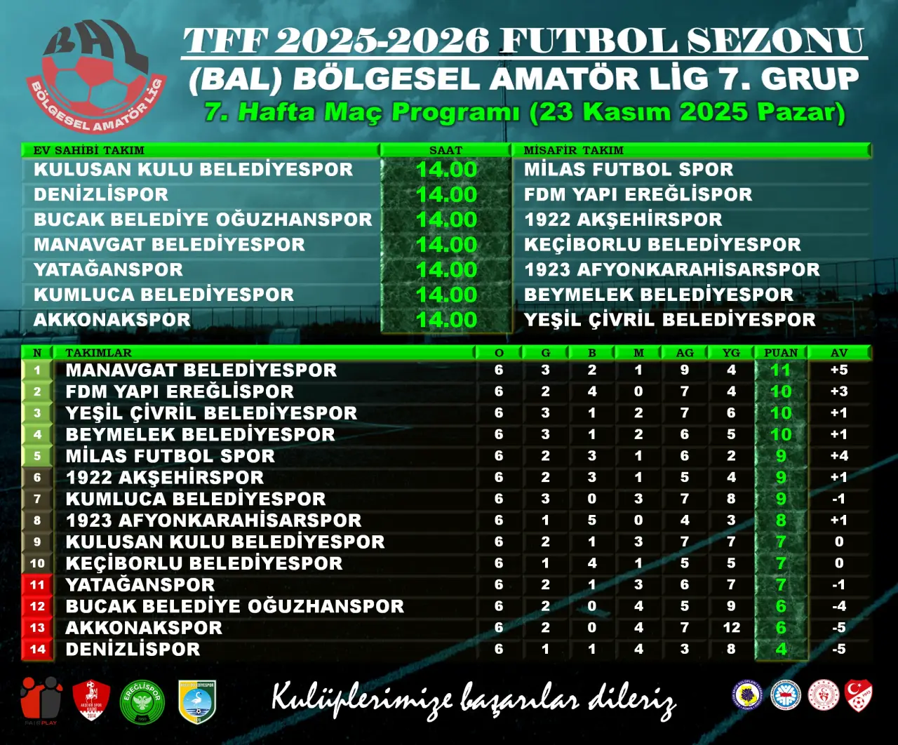 7 puanı bulunan Kulusan Kulu Belediyespor ise taraftarının önünde Muğla ekibi Milasspor’u konuk edecek. Ligde haftanın tüm maçları bugün saat 14.00’te oynanacak.