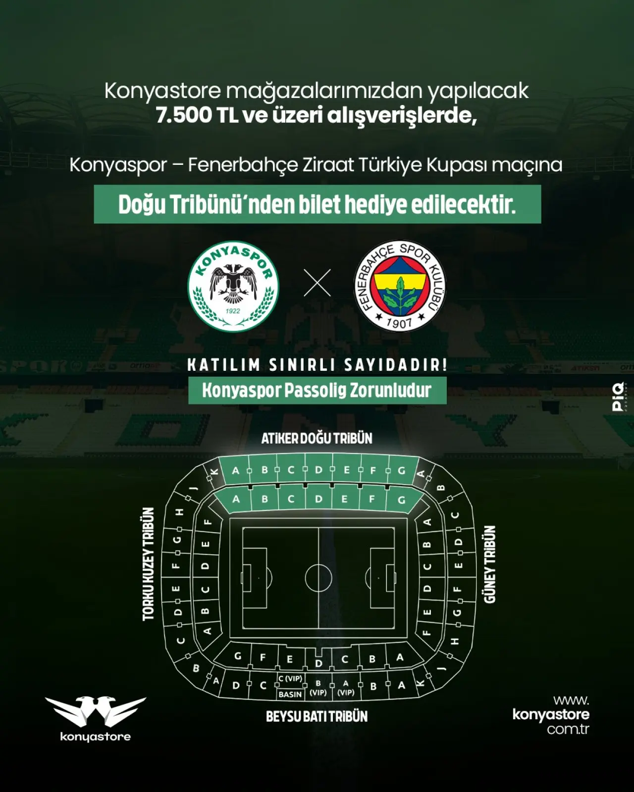 Yeşil-beyazlı kulüp, taraftarlarına bu maç için kampanya duyurusu yaptı. Konya Store mağazalarından yapılacak 7 bin 500 TL ve üzeri alışverişlerde Konyaspor – Fenerbahçe maçına Doğu Tribünü’nden ücretsiz bilet tanımlanacak.
