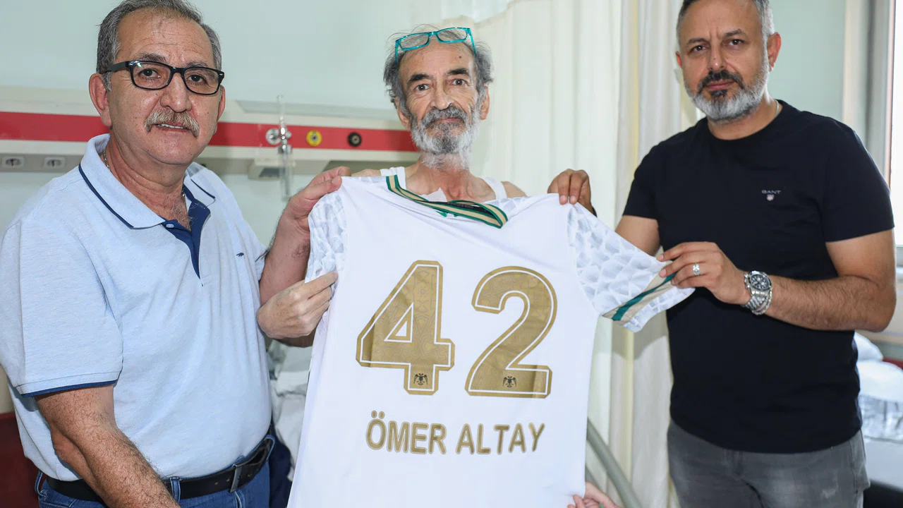 Ziyarette geçmiş olsun dileklerini ileten Başkan Korkmaz, Ömer Altay'a yeni sezon formalardan hediye etti.