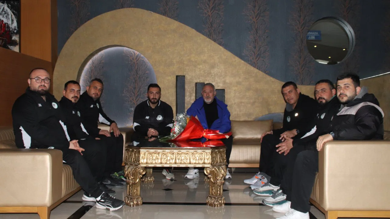 Dostane bir ortamda gerçekleşen ziyarette Hakan Şahin, teknik direktör Çağdaş Çankaya’ya günün anısına çiçek takdim etti.