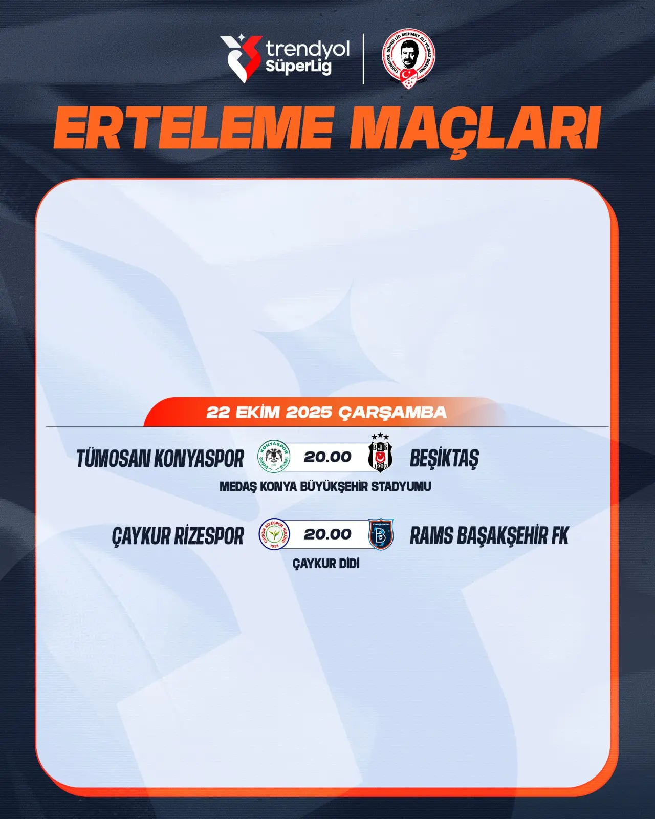 Tümosan Konyaspor - Beşiktaş ve Çaykur Rizespor - Başakşehir FK müsabakaları 22 Ekim 2025 Çarşamba günü saat 20.00'de oynanacak.
