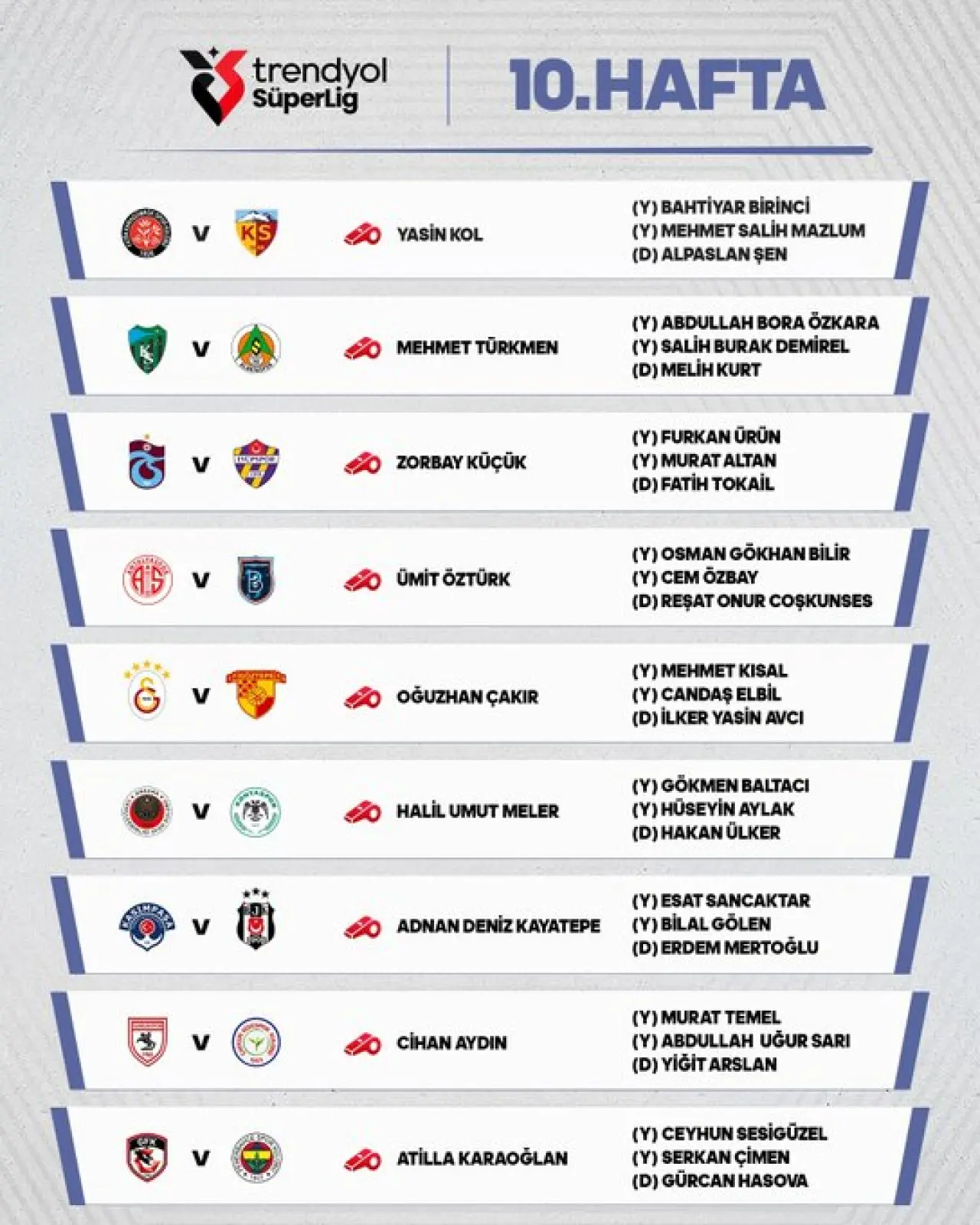 Süper Lig'de 10. haftada düdük çalacak hakemler şöyle: