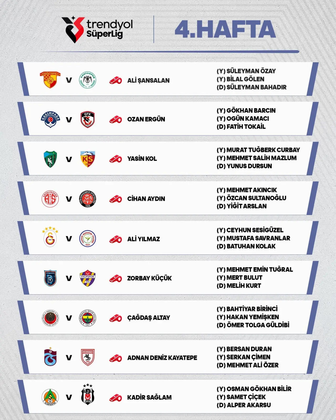 Süper Lig’de 4. hafta programı ve maçları yönetecek hakemler şöyle: