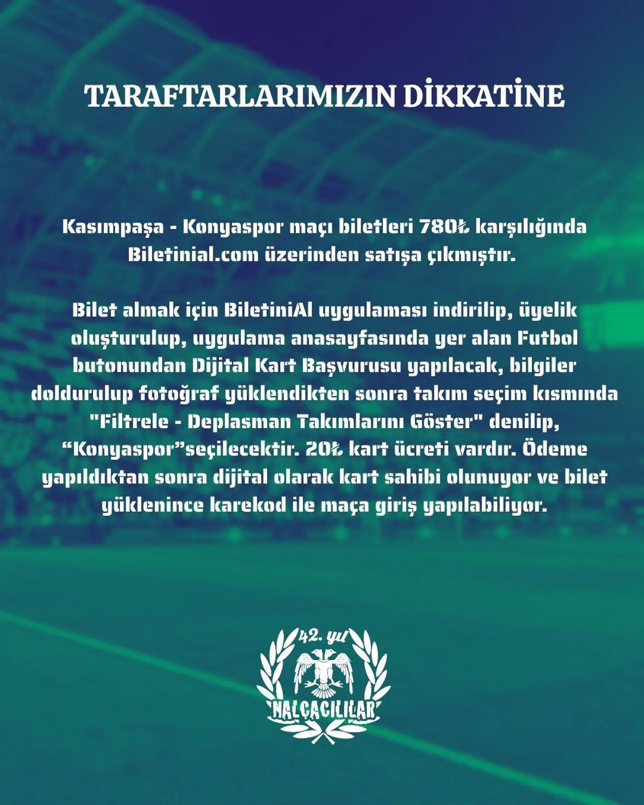 Nalçacılılar’dan yapılan açıklamada, “Kasımpaşa - Konyaspor maçı biletleri 780 TL karşılığında Biletinial.com üzerinden satışa çıkmıştır. Bilet almak için BiletiniAl uygulaması indirilip, üyelik oluşturulup, uygulama ana sayfasında yer alan Futbol butonundan Dijital Kart Başvurusu yapılacak, bilgiler doldurulup fotoğraf yüklendikten sonra takım seçim kısmında "Filtrele - Deplasman Takımlarını Göster" denilip, "Konyaspor"seçilecektir. 20 TL kart ücreti vardır. Ödeme yapıldıktan sonra dijital olarak kart sahibi olunuyor ve bilet yüklenince karekod ile maça giriş yapılabiliyor” denildi.