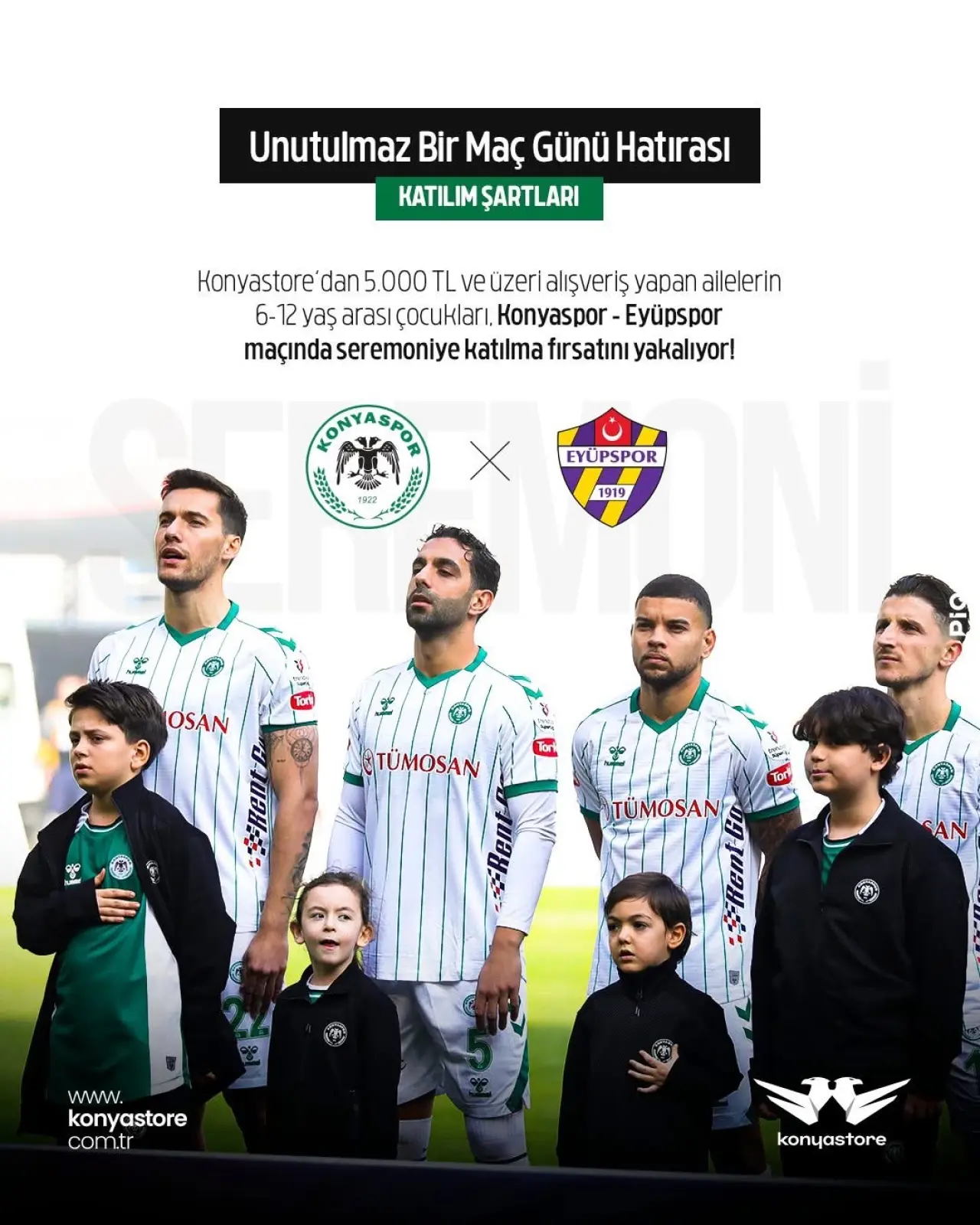 Konyaspor, taraftar ailelere ve çocuklara yönelik anlamlı bir etkinliğe imza atıyor. Konyastore’dan 5 bin TL ve üzeri alışveriş yapan ailelerin 6-12 yaş arasındaki çocukları, Konyaspor – Eyüpspor karşılaşmasında seremoniye katılma fırsatı yakalayacak.