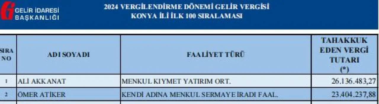 Geçtiğimiz yıl Konya’da en çok vergi veren kişiler açıklandı. Birçok isim adının açıklanmasını istemezken listede Konyaspor’dan birçok isim bulunuyor. Gelir İdaresi Başkanlığı tarafından açıklanan 100 kişilik tablonun ilk sırasında Konyaspor’un eski yöneticilerinden Ali Akkanat 26 milyon 137 bin TL ile yer alıyor.