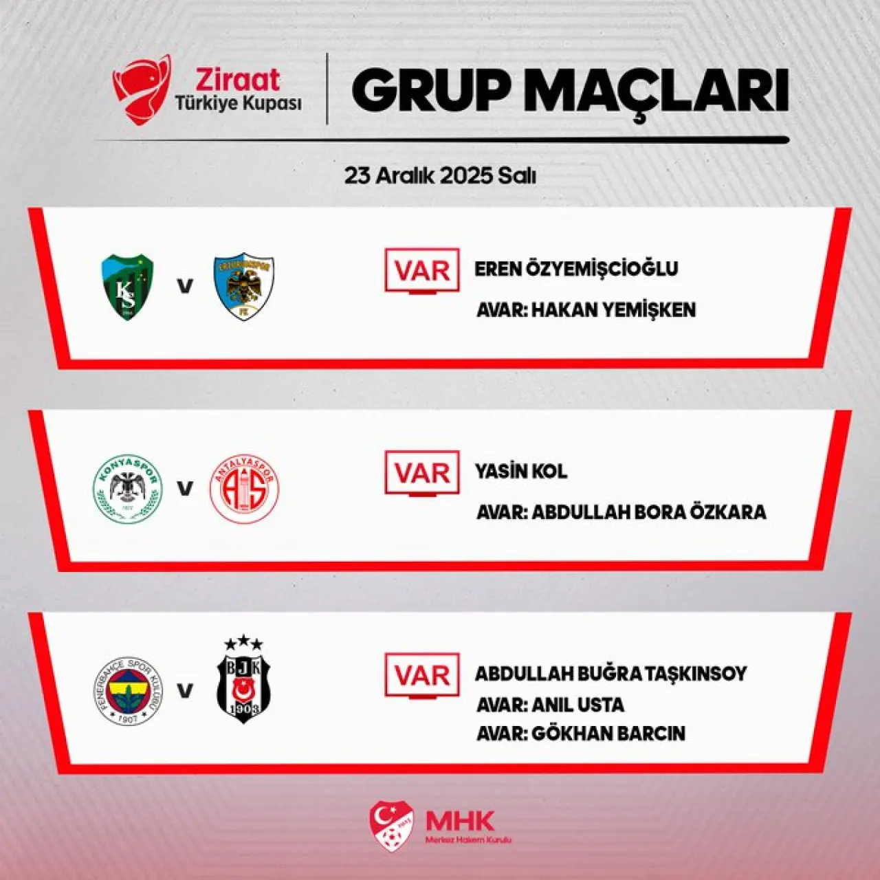 Merkez Hakem Kurulu, günün VAR hakemlerini açıkladı. Konyaspor - Antalyaspor maçında VAR koltuğunda Yasin Kol oturacak.