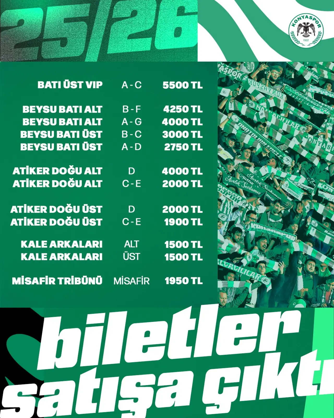 22 Ekim Çarşamba günü saat 20.00’de MEDAŞ Konya Büyükşehir Stadyumu’nda oynanacak maçın biletleri satışa çıktı. İstanbul takımları için belirlenen fiyat tarifesi üzerinden biletler satışa çıktı.