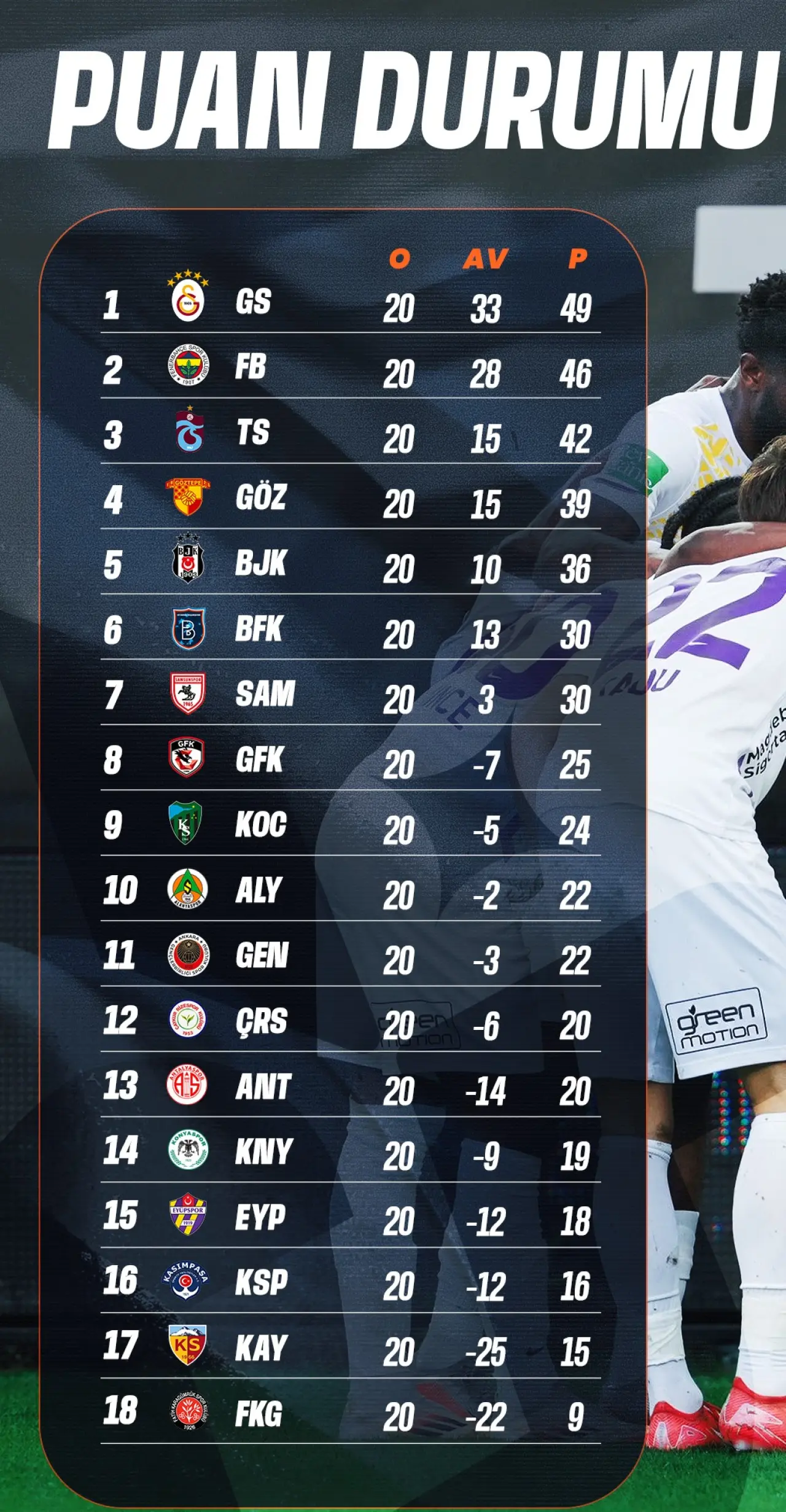 Sahasında Kayserispor'u 4-0 mağlup eden Galatasaray, 49 puanla liderliğini devam ettirdi. Kocaeli’den 2-0’lık galibiyetle dönen Fenerbahçe ise 46 puanla ikinci sırada zirve takibini sürdürdü.