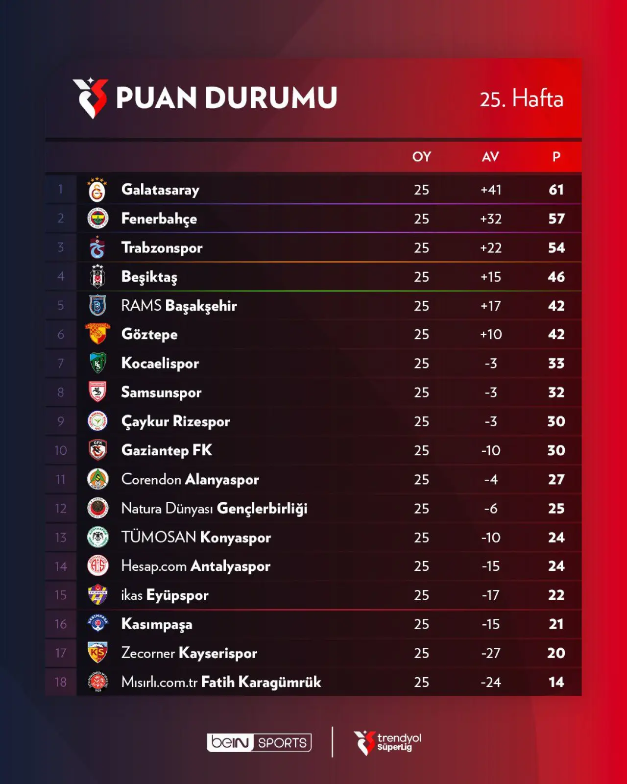 Galatasaray, haftayı 61 puanla lider kapatırken, Fenerbahçe 57, Trabzonspor 54 puanla sıralandı.