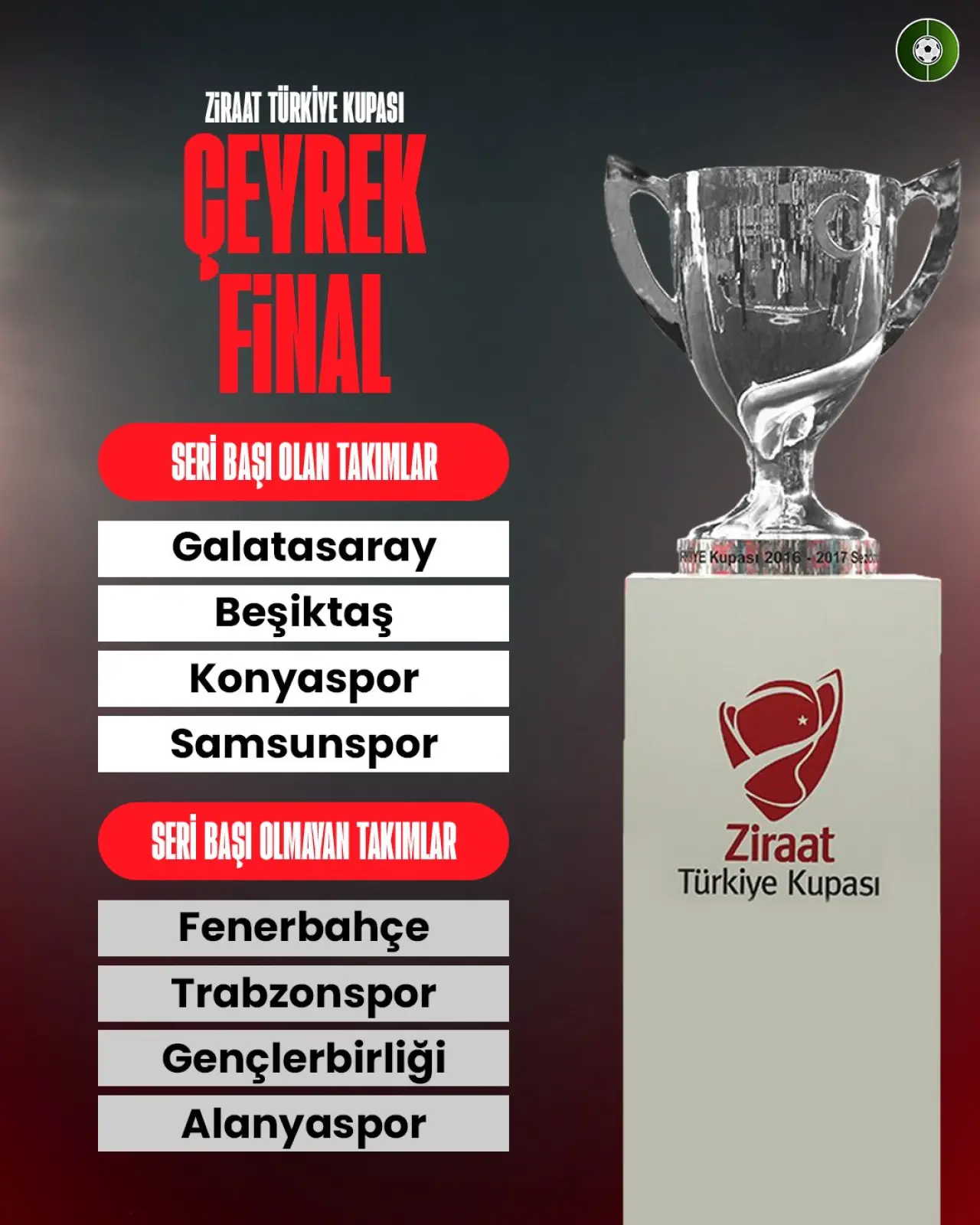 Konyaspor, çeyrek finalde seribaşı oldu. Temsilcimizin muhtemel rakipleri Fenerbahçe, Trabzonspor, Alanyaspor ve Gençlerbirliği oldu.