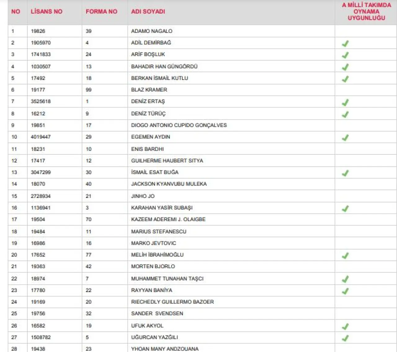 Kadro dışı olan Josip Calusic ve Pedrinho, yabancı kontenjanı sebebiyle listede bulunmuyor. Bu iki oyuncu sezonun ikinci devresini boş geçirecek.