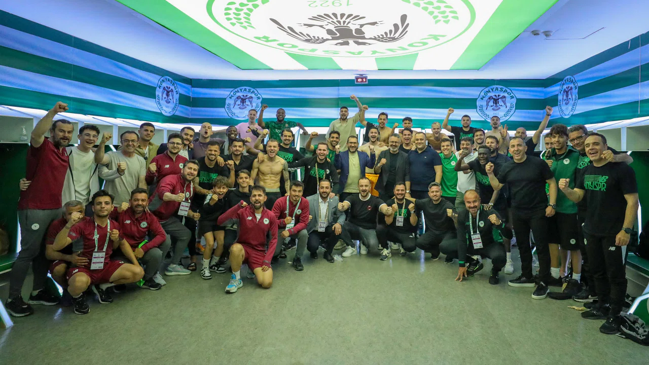 Tümosan Konyaspor’da Çaykur Rizespor galibiyetinin ardından büyük mutluluk yaşanırken soyunma odasında klasikleşen zafer fotoğrafı da verildi. Mücadeleyi locada takip eden Başkan Ömer Korkmaz ve yöneticiler, son düdüğün ardından 3 puanın sevincini yaşadı.