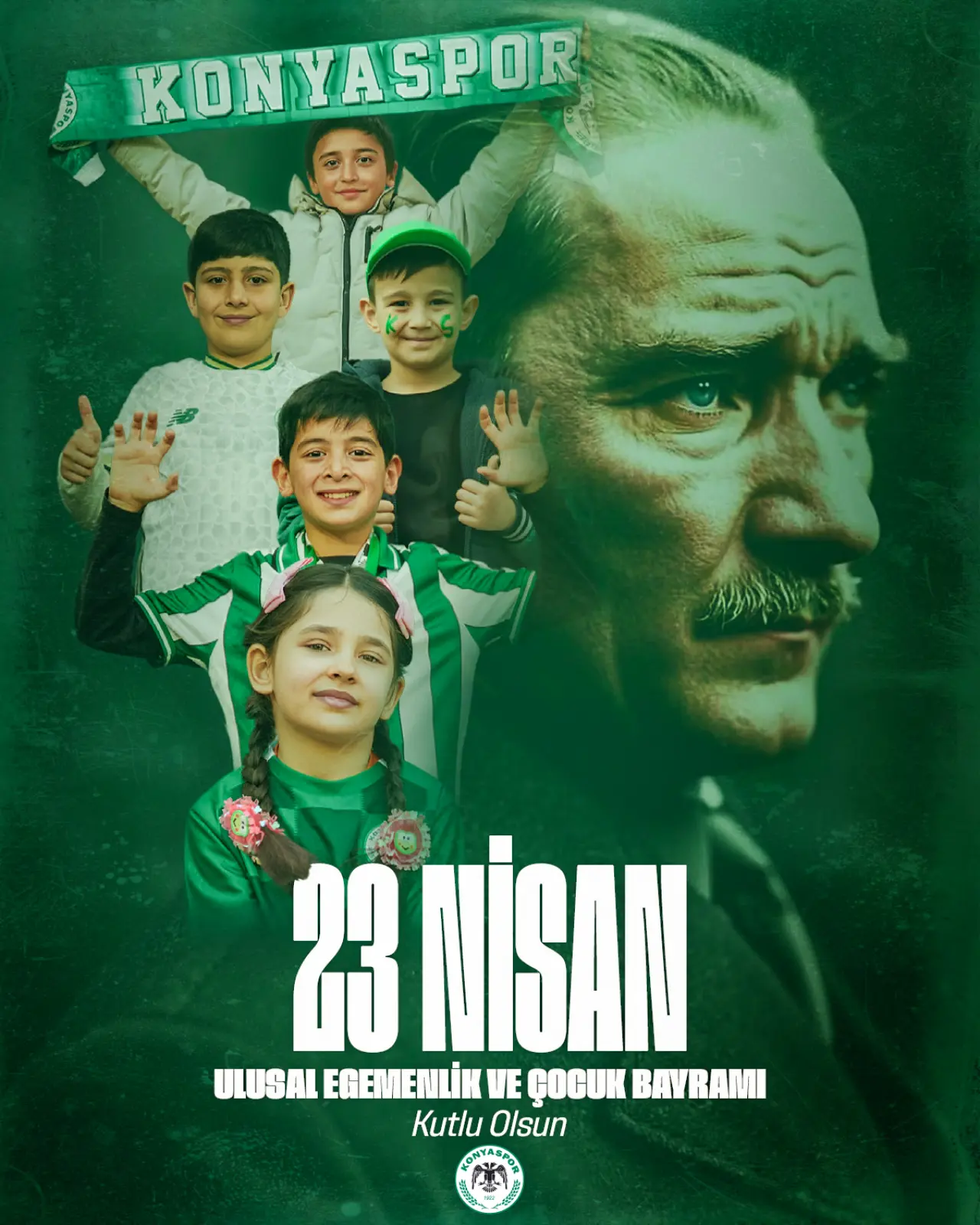 Konyaspor Kulübü de sosyal medya hesaplarından 23 Nisan’ı kutladı. Yeşil-beyazlı kulüpten yapılan paylaşımda, “Bağımsızlığımızın sembolü Gazi Meclisimizin kuruluşunun ve Gazi Mustafa Kemal Atatürk’ün dünya çocuklarına armağan etti. 23 Nisan Ulusal Egemenlik ve Çocuk Bayramımız kutlu olsun. Küçük hanımlar, küçük beyler! Sizler hepiniz, geleceğin bir gülü, yıldızı, bir ikbal ışığısınız” ifadelerine yer verildi.