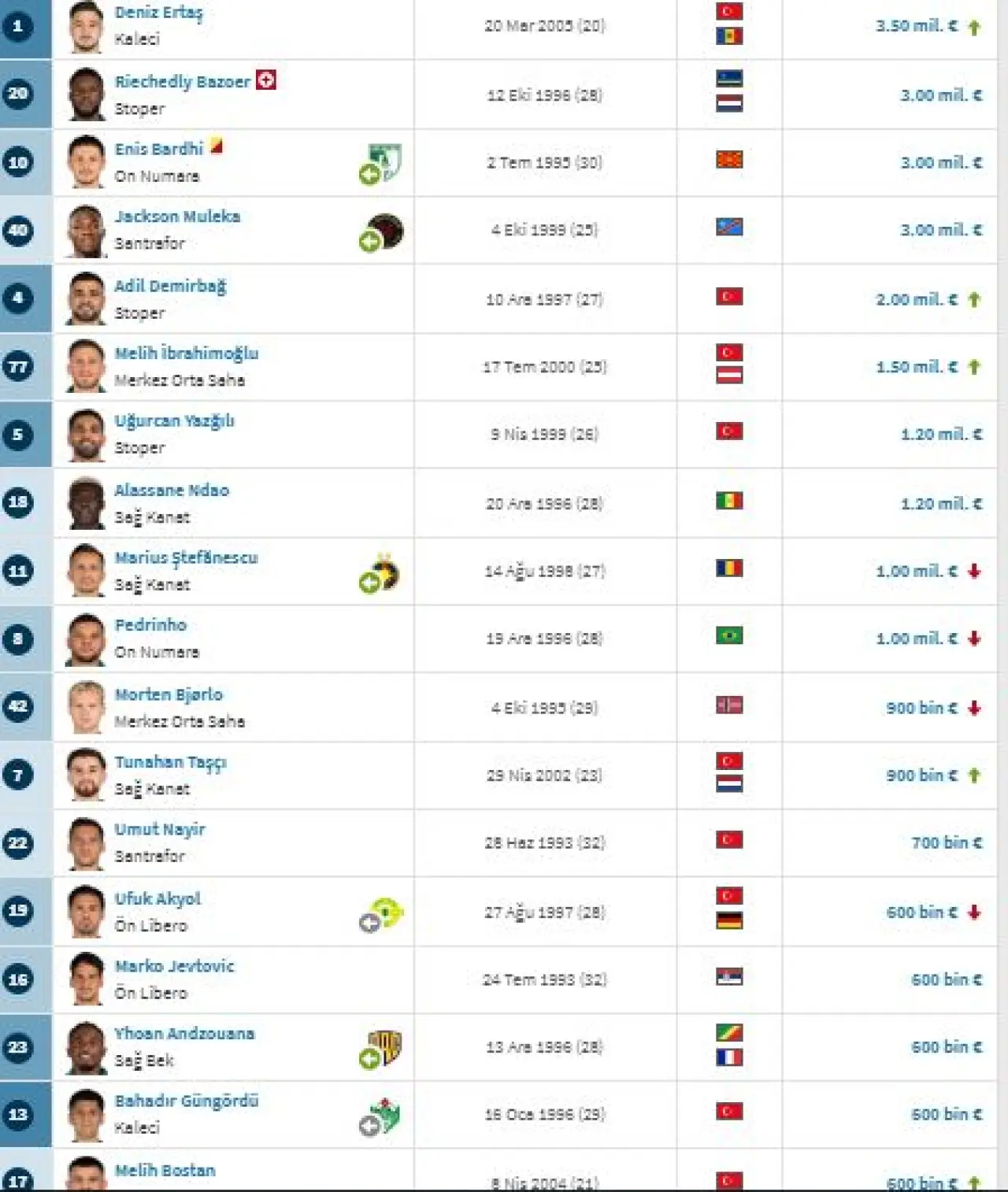 Marius Stefanescu ve Pedrinho'nun ise 1 milyona, Morten Bjorlo'nun da 900 bine geriledi. Takımın deneyimli isimlerinden Umut Nayir’in güncel piyasa değeri 700 bin Euro’da sabit kaldı.