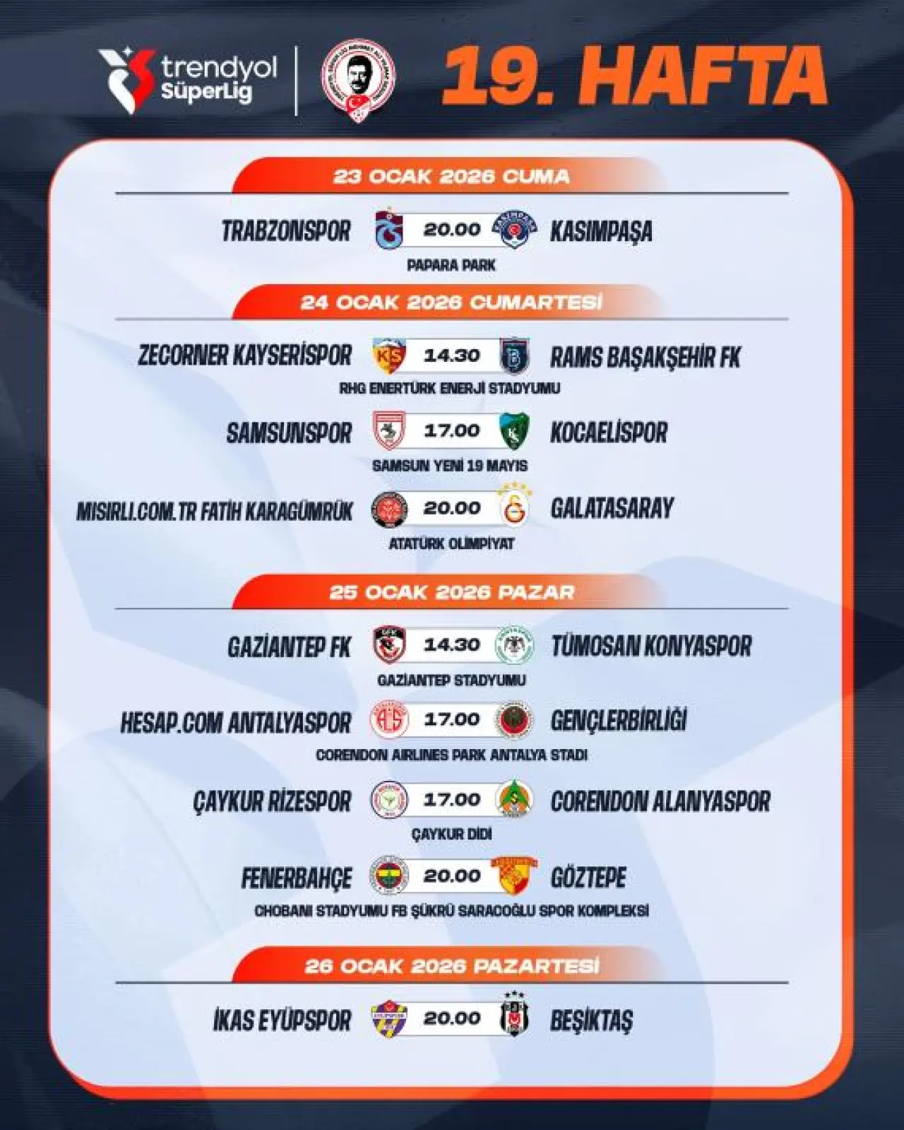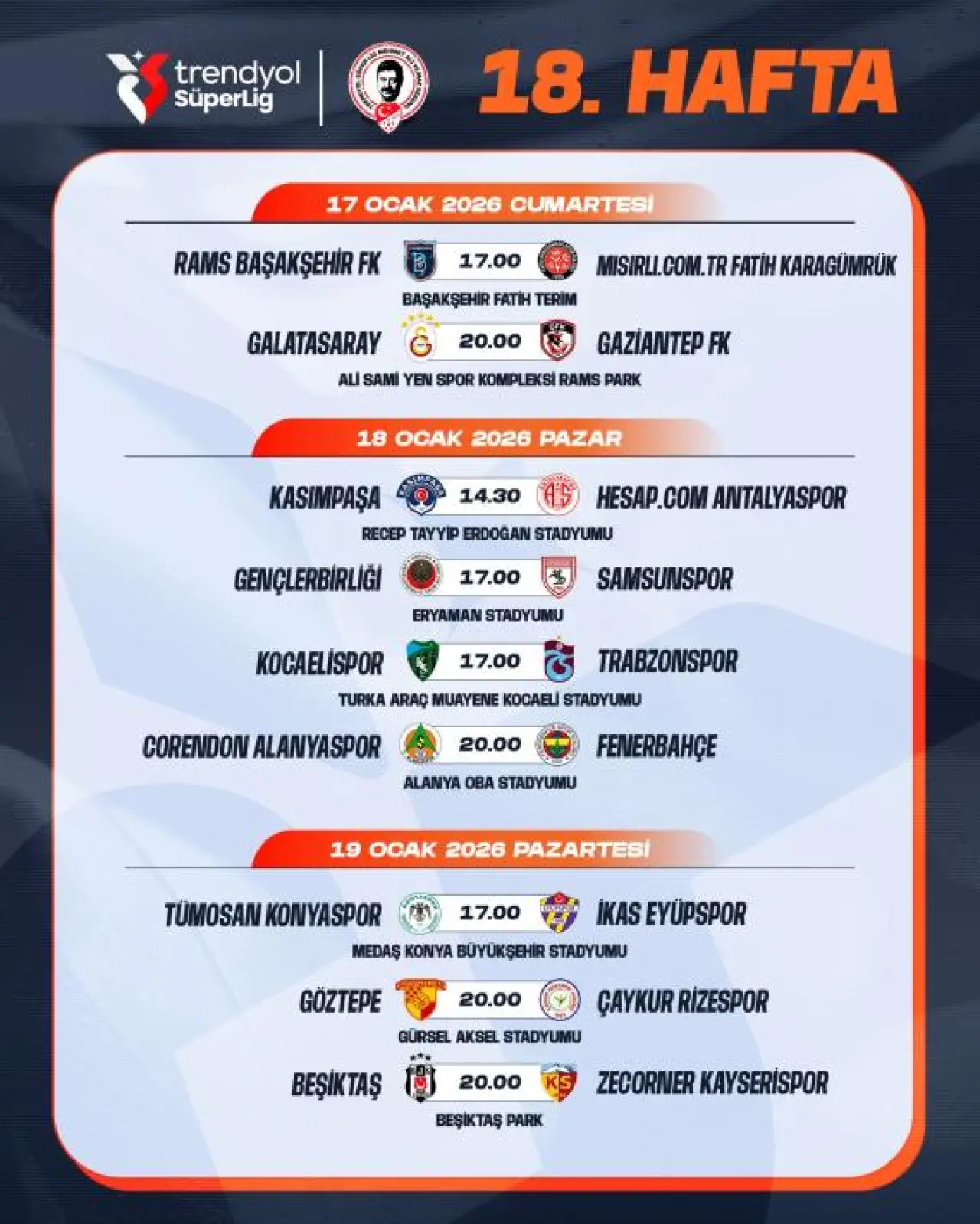 Trendyol Süper Lig'de 18 ve 19. hafta maç programları açıklandı. Tümosan Konyaspor, 18. haftada evinde Eyüpspor, 19. haftada ise deplasmandas Gaziantep FK ile karşı karşıya gelecek.
