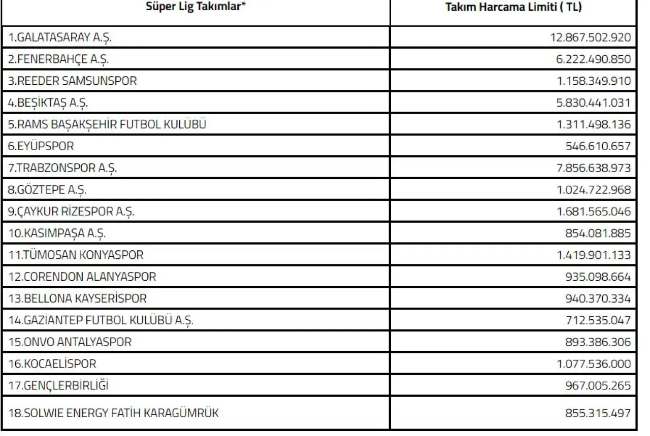 Bu takımların ardından Çaykur Rizespor, 1 milyar 681 milyon ile 5. sırada yer aldı. 546 milyon TL ile Eyüpspor, harcama limitinde Süper Lig’de son sırada yer alıyor.