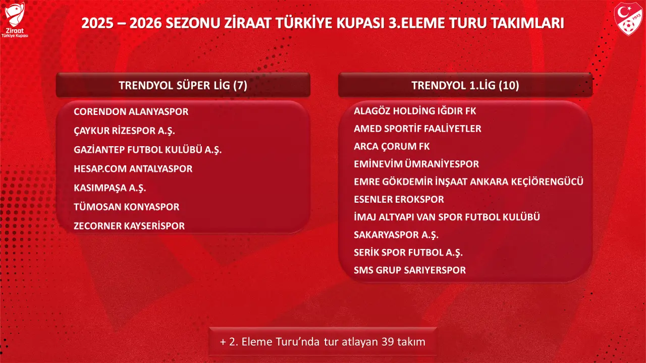 Ziraat Türkiye Kupası 3. Eleme Turu Kura Çekimi 26 Eylül Cuma günü yapılacak. Saat 14.30'da Riva'da gerçekleştirilecek törene TFF yetkilileri ile kulüp temsilcileri katılacak.