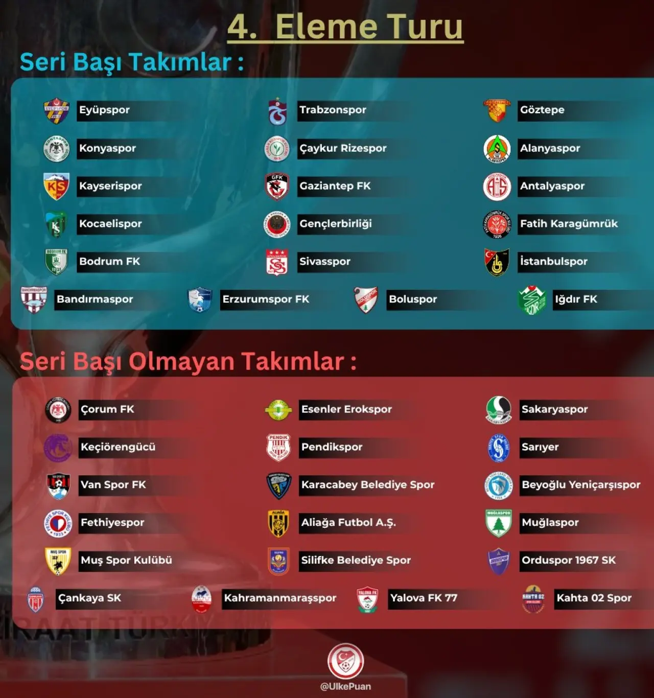 Ziraat Türkiye Kupası 4. Eleme Turu Kura Çekimi, 6 Kasım Perşembe günü saat 15.00'te kulüp yetkililerinin katılımı ile Riva'da gerçekleştirilecek.