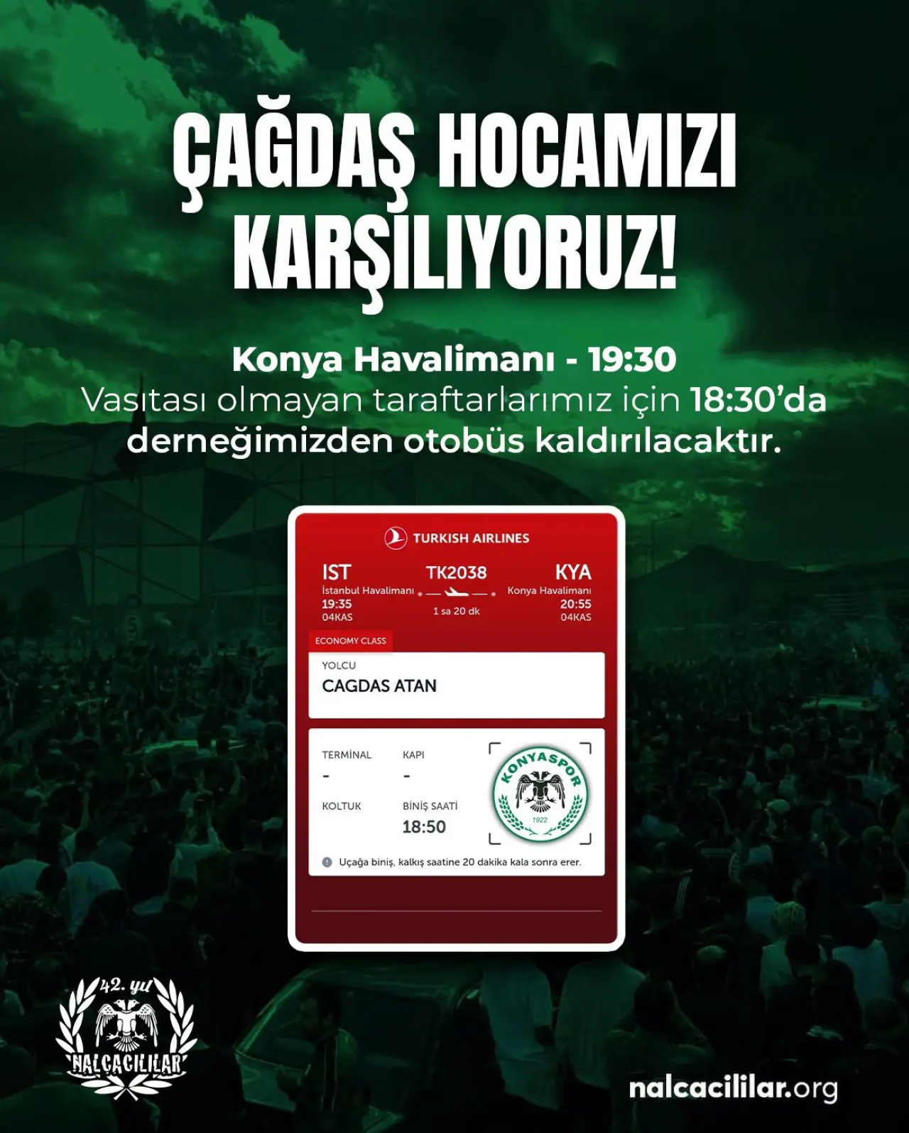 45 yaşındaki teknik adam, saat 19.35'de İstanbul Havalimanından kalkacak Türk Hava Yolları TK2035 sayılı seferiyle Konya'ya gelecek. Saat 20.55 sularında Konya Havalimanına inmesi beklenen Çağdaş Atan'ı Konyaspor taraftarları coşkulu bir şekilde karşılalayacak.