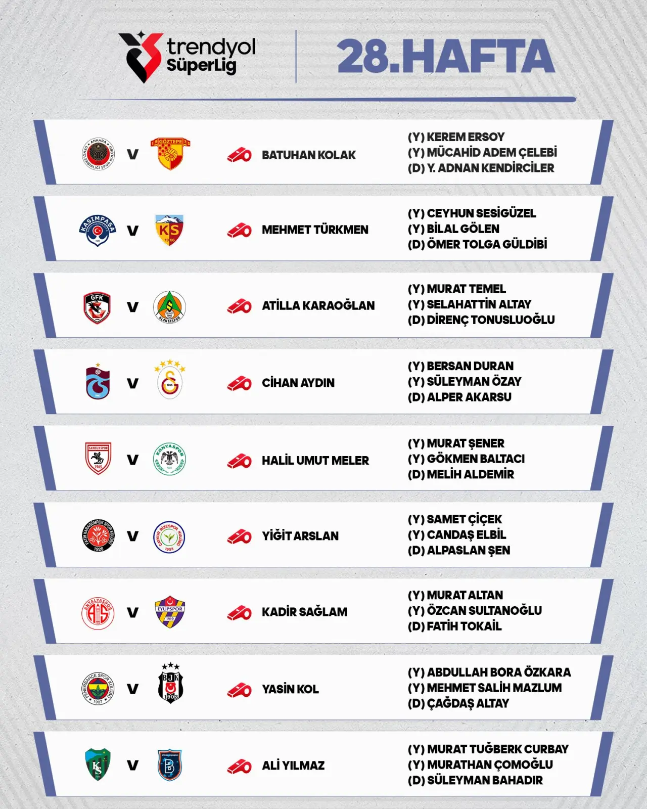 Trendyol Süper Lig'de 28. hafta hakemleri açıklandı. Tümosan Konyaspor'un 5 Nisan Pazar günü deplasmanda oynayacağı Samsunspor maçını FIFA kokartlı hakem Halil Umut Meler yönetecek.