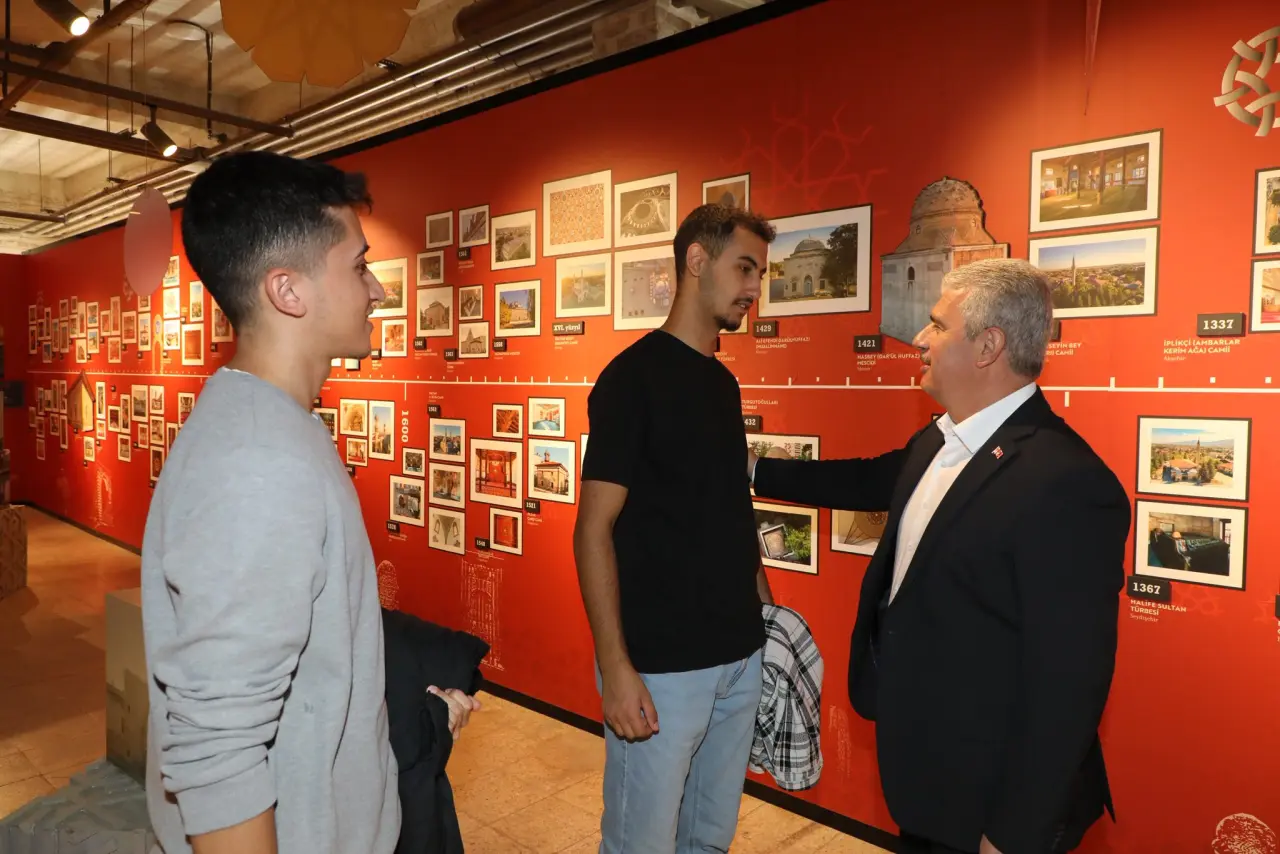 Vali Akın, ziyaret kapsamında Meydan Evlerinde Sanat: Hat ve Ebru Sergisi, AYNA – Anadolu Göğünün İpek Mahyası: Konya Vakıf Eserleri Fotoğraf ve Deneyim Sergisi ve “Âdil-i Mutlak” Albayrak 2025 Hat Eserleri Sergisini inceledi.
