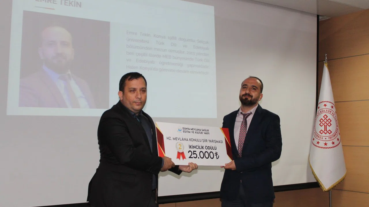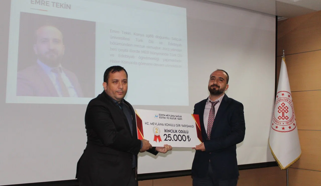 Dünya Mevlâna Vakfı’nın tertip ettiği Hz. Mevlâna konulu şiir yarışması ödül töreninde 2. ye 25.000 TL, üçüncüye 10.000 TL ve mansiyon ödülü olarak 5.000’er TL olmak üzere 3 adet mansiyon ödülü sahiplerine verilmiştir.