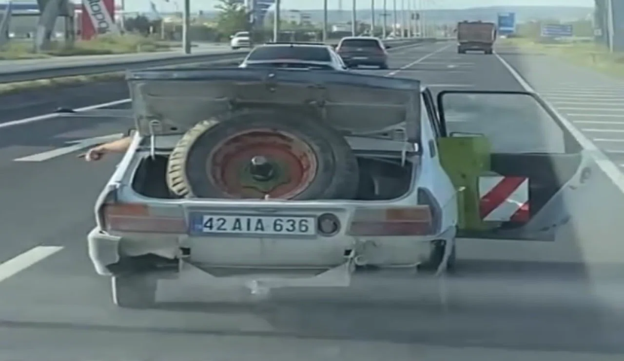 Görüntülerde, seyir halindeki aracın bagaj ve sağ arka kapısı açık seyretmesi, sürücünün ise eliyle sinyal işareti vermesi görülüyor.