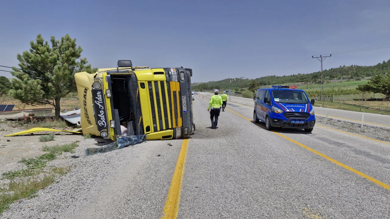 Karaman’da kontrolden çıkan tırın yol kenarına devrilmesi sonucu sürücüsü yaralandı.