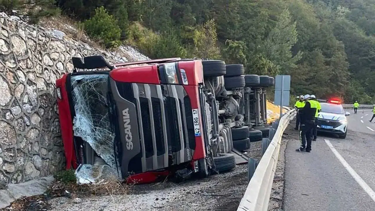 Kaza saat 07.30 sıralarında Bursa - Ankara karayolu üzeri İnegöl Mezit boğazında meydana geldi Konya'dan Bursa'ya seyir halinde olan Ahmet S.(32) yönetimindeki 42 ERG 17 plakalı TIR, virajda sürücüsünün kontrolünden çıktı. Yoldan çıkan TIR, istinat duvarına çarpıp devrildi. Kaza sonucu sürücü ile yanındaki eşi Saliha S.(34) yaralandı.