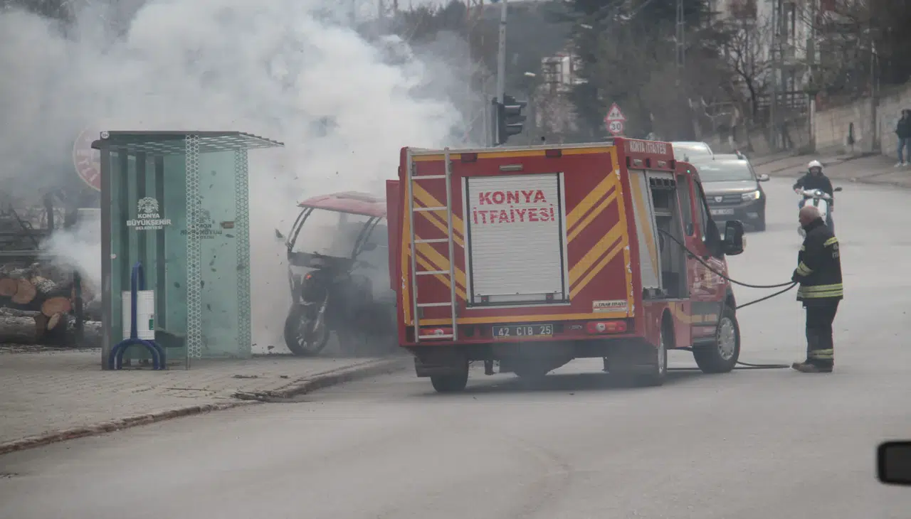 Konya’nın Beyşehir ilçesinde elektrikli üç tekerlekli motosiklet park halindeyken bir anda alev aldı. Olay, Hacıakif Mahallesi Özdilek Caddesi üzerinde meydana geldi.