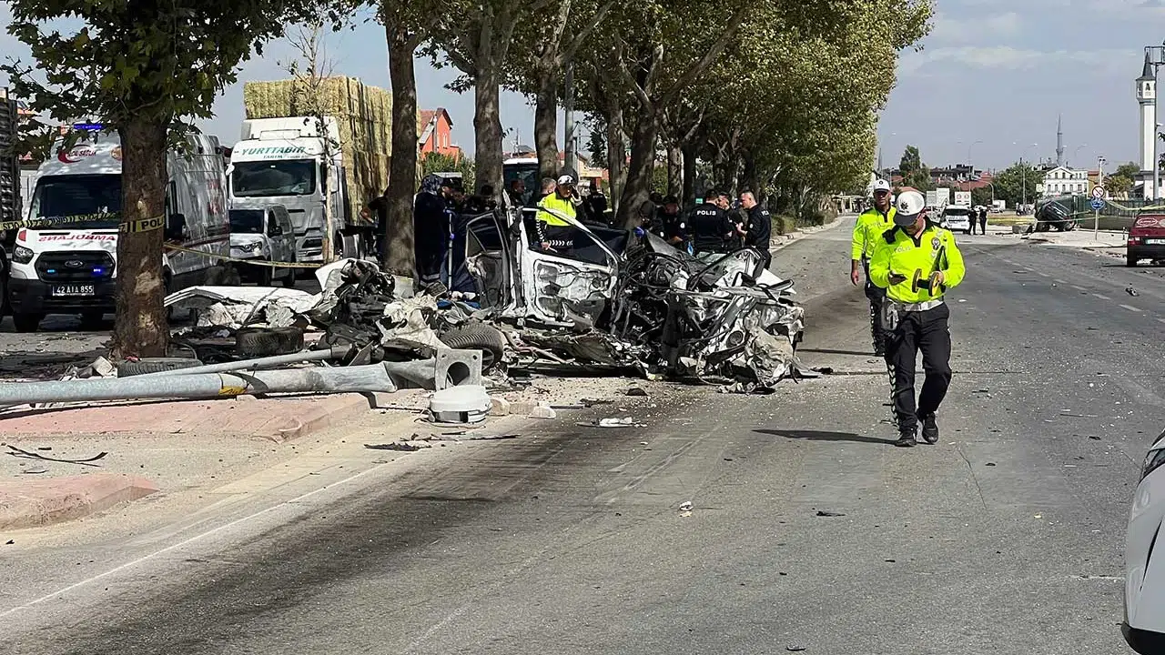Konya'nın Meram ilçesinde kırmızı ışıkta bekleyen otomobil, süratli bir şekilde gelen başka bir otomobilin çarpması sonucu direğe ve ağaca çarpıp ikiye bölündü. Kazada 1 kişi hayatını kaybetti, 1 kişi de yaralandı.