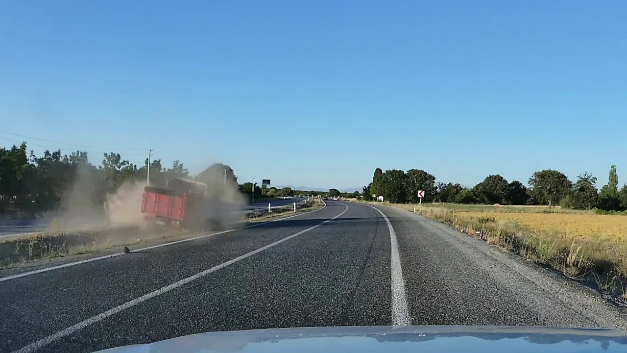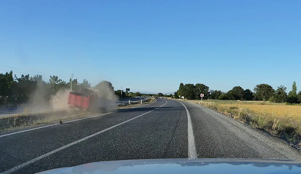 Konya'nın Beyşehir ilçesinde seyir halindeyken lastiğinin patlaması sonucu kontrolden çıkan kamyon refüje inerken, sürücü ustalıkla kamyonu devrilmeden ve karşı şeride geçip muhtemel başka bir kazaya sebep olmadan durdurmayı başardı. Yaşanan korku dolu anlar arkada seyir halinde olan bir otomobilin araç kamerasına yansıdı.