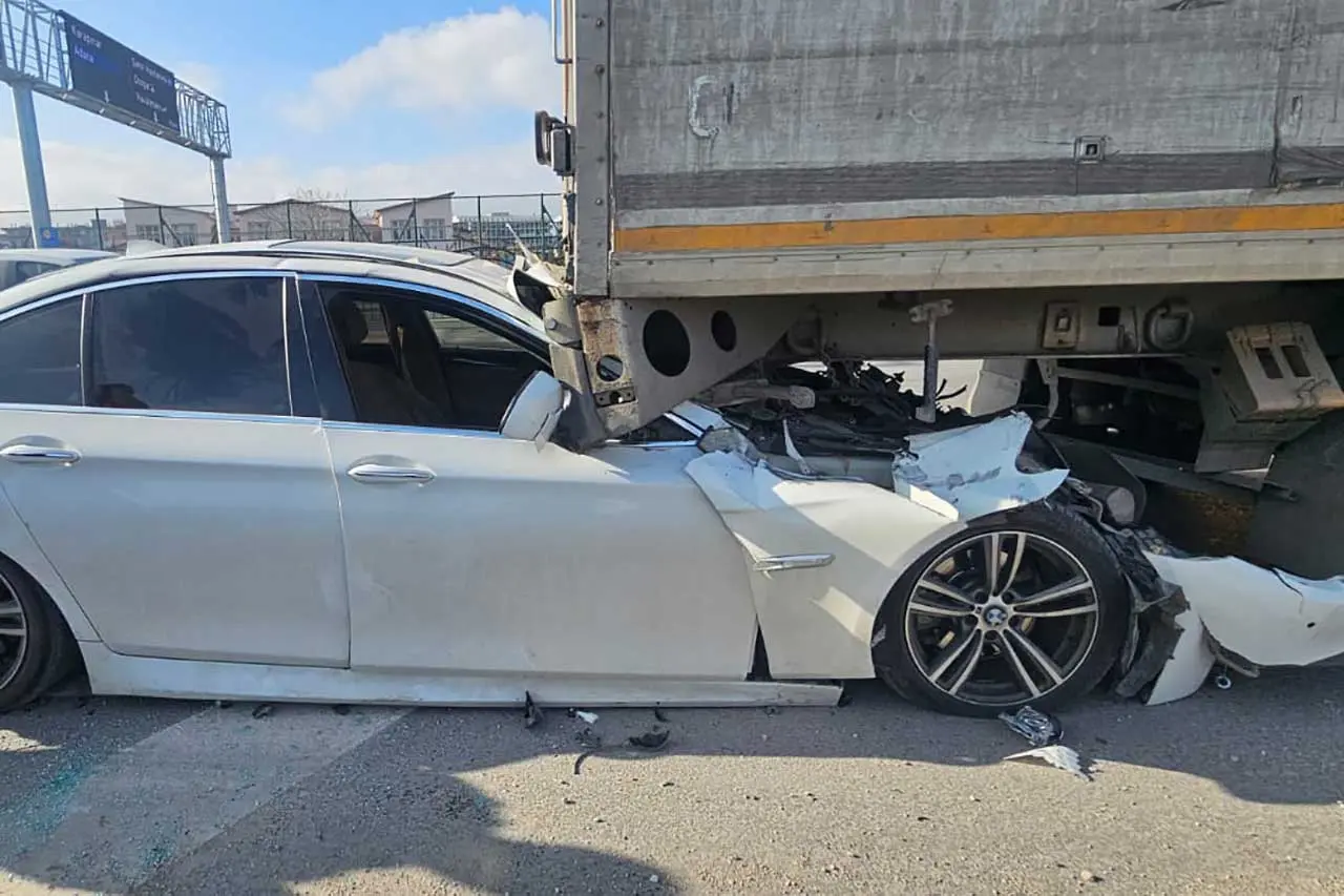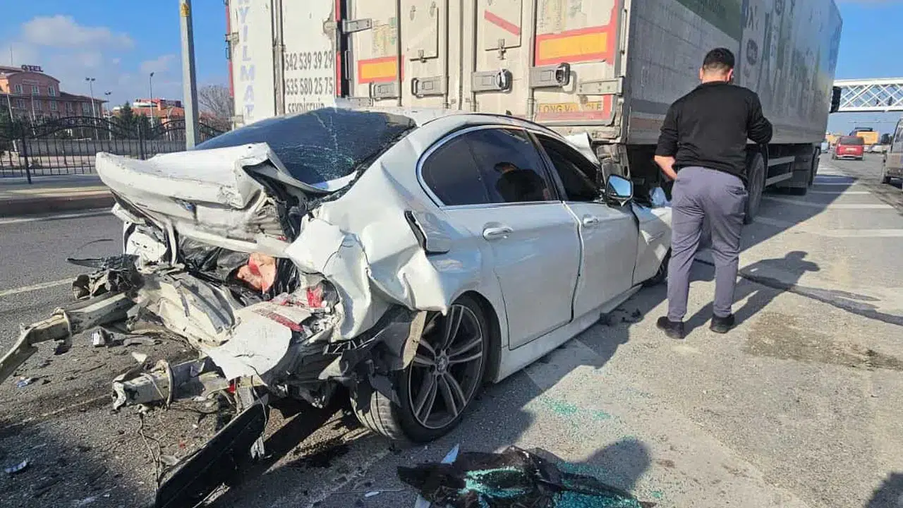 Konya'da meydana gelen trafik kazasında, seyir halindeki lüks bir otomobil, önünde ilerleyen kamyonete arkadan çarptı. Kazada otomobil TIR’ın altına girerek hurdaya döndü.