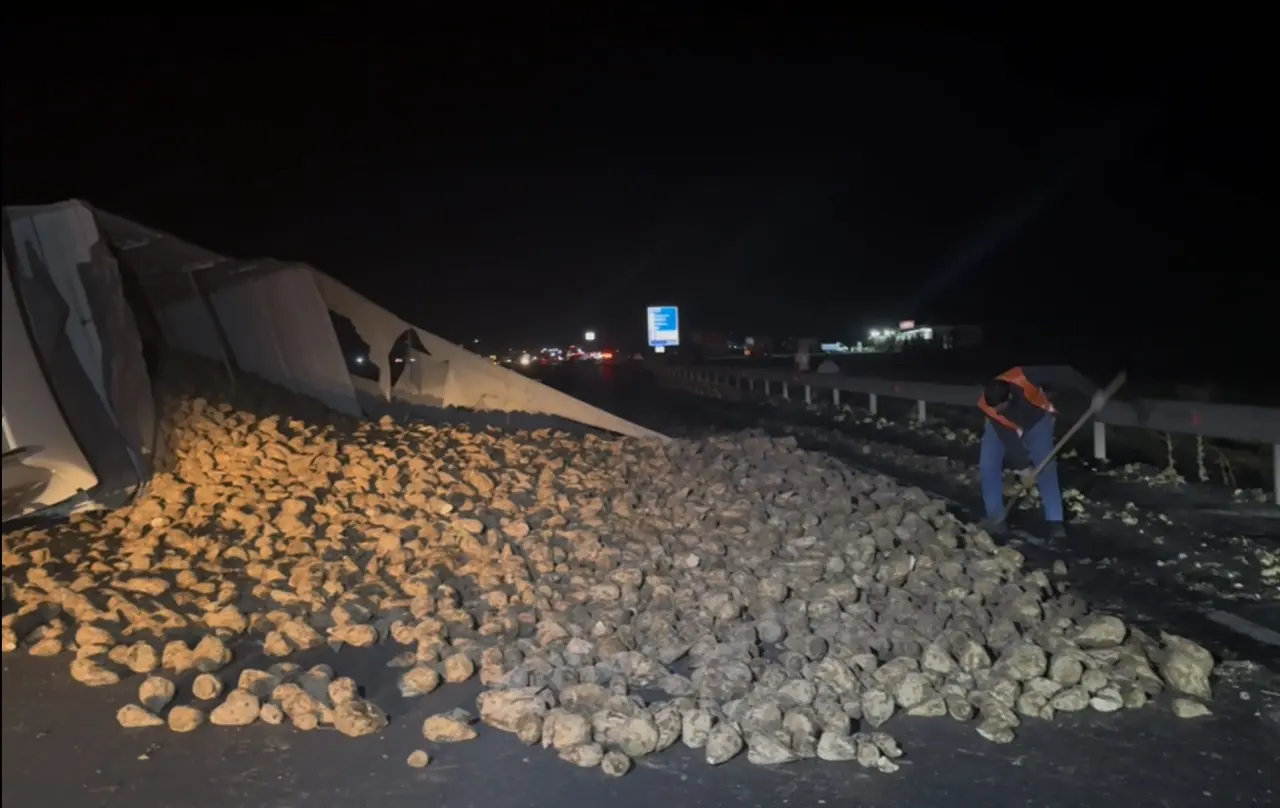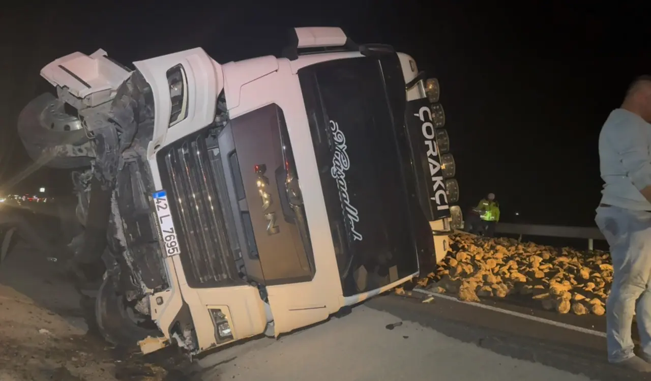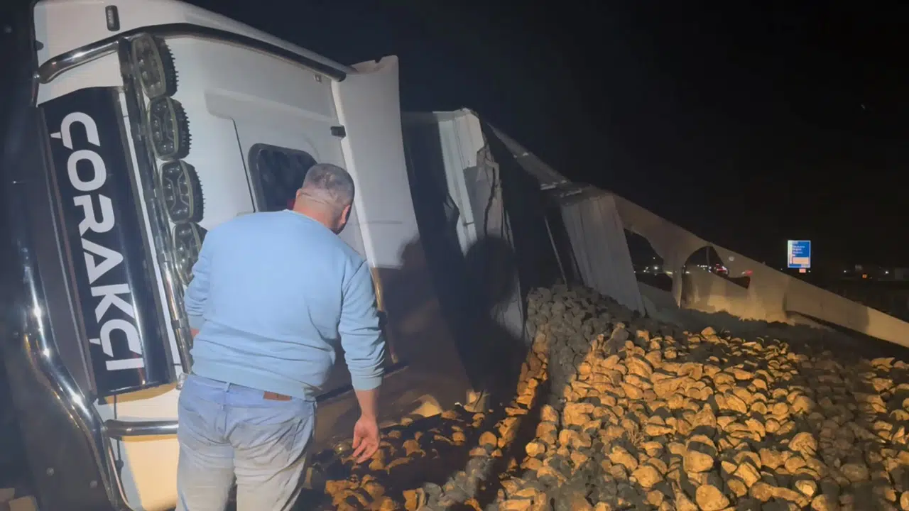 Manevra sırasında direksiyon hakimiyetini kaybeden sürücünün kullandığı tır refüje devrildi. Dorsedeki pancarların yola saçılması nedeniyle trafik kısa süreliğine durma noktasına geldi.