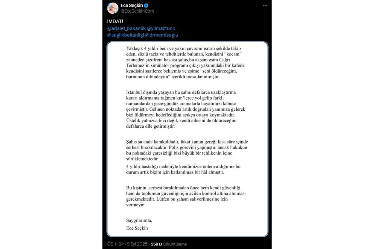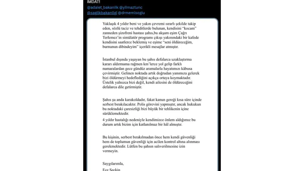 Yaşadıklarını sosyal medya hesabından yaptığı paylaşım ile duyuran Ece Seçkin, "Yaklaşık dört yıldır beni ve yakın çevremi ısrarlı şekilde takip eden, sözlü taciz ve tehditlerde bulunan, kendisini "Kocam" zanneden şizofreni hastası şahıs, eşim Çağrı Terlemez'in simülatör programı çıkışı yakınındaki bir kafede kendisini saatlerce beklemiş ve eşime "Seni öldüreceğim, burnunun dibindeyim" içerikli mesajlar atmıştır. İstanbul dışında yaşayan bu şahıs defalarca uzaklaştırma kararı aldırmama rağmen kilometrelerce yol gelip farklı numaralardan gece gündüz aramalarla hayatımızı kabusa çevirmiştir. Gelinen nokta artık doğrudan yanımıza gelerek bizi öldürmeyi hedeflediğini açıkça ortaya koymaktadır. Üstelik yalnızca bizi değil, kendi ailesini de öldüreceğini defalarca dile getirmiştir. Şahıs şuan karakoldadır, fakat konunun gereği kısa süre içinde serbest bırakılacaktır. Polis görevini yapmıştır, ancak hukukun bu noktadaki çaresizliği bizi büyük bir tehlikenin içine sürüklemektedir. Dört yıldır hastalığı nedeniyle kendimizce önlem aldığımız bu durum artık bizim için katlanılmaz bir hal almıştır. Bu kişinin, serbest bırakılmadan önce hem kendi güvenliği hem toplumun güvenliği için acilen kontrol altına alınması gerekmektedir. Lütfen bu şahsın salıverilmesine izin vermeyin" ifadelerini kullandı.