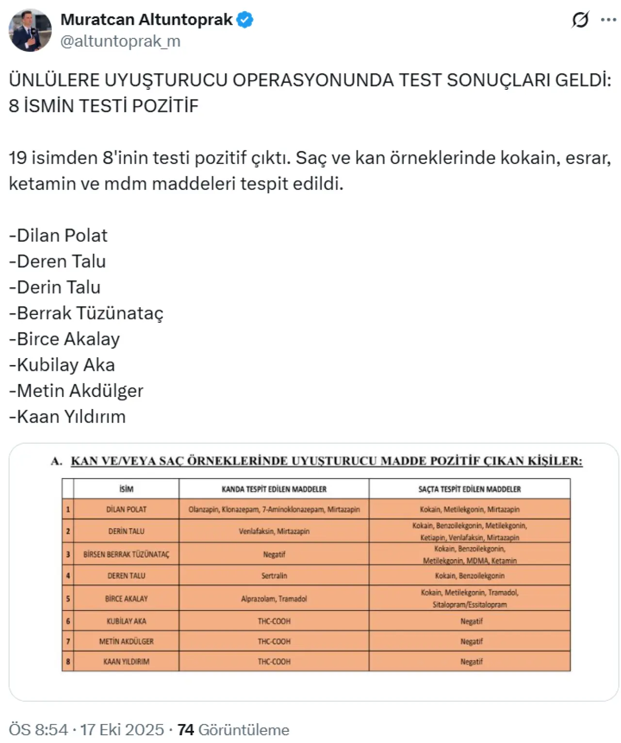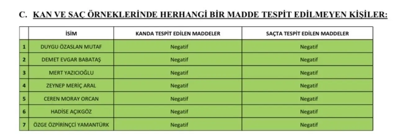 İstanbul Cumhuriyet Başsavcılığı tarafından kamuoyunca tanınan isimlere yönelik düzenlenen uyuşturucu operasyonunda yeni gelişmeler yaşandı. Operasyon kapsamında gözaltına alınan ünlülerden alınan saç ve kan örneklerinin sonuçları belli oldu.